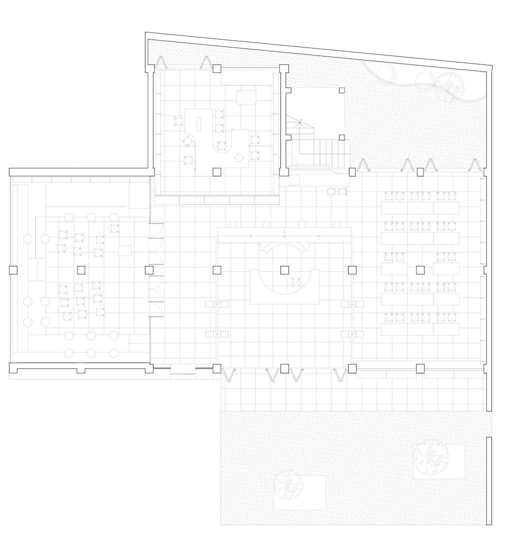 01. 设计破题:一种策略原型的生成 成都树德实验中学图书室的改造,面临着典型的老旧校舍更新困境。项目位于一栋建于上世纪七八十年代的老建筑底层,历经修缮与产权变更,原始结构设计不可考。在这个正交网格的空间内,校方希望满足阅读功能之余,还能兼顾会议、多功能教学、教师备课以及展览等复合需求。