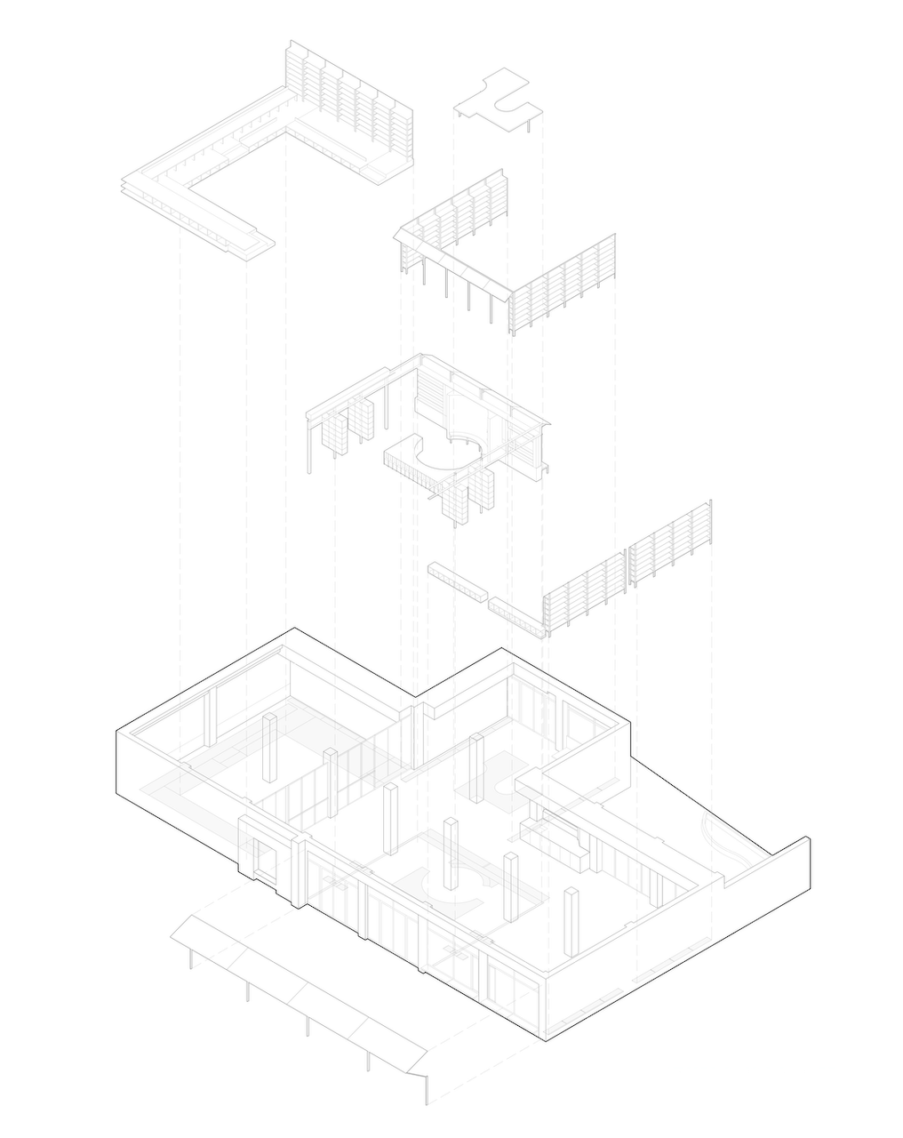 © 刘国威 02. 置入一套插件系统 为了实现这种自由互动,设计上也采用了一种“脱开”的策略:在室内直接置入一套完全自承重的插件系统。这些插件有点像是一组放大版的“健身器材”。它们不借力于原始墙体,尽力规避老建筑不可预知的结构风险。通过“旋转”这一行为,进行简单的组合与切换,来满足不同时段的使用需求。