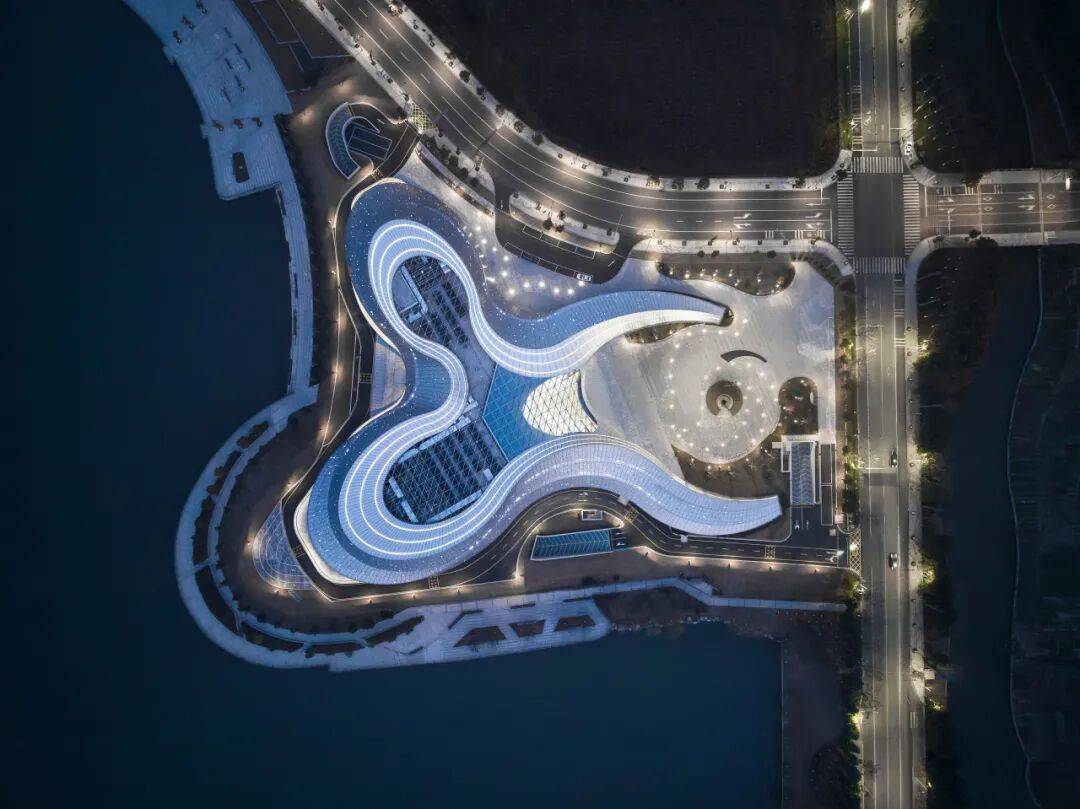 夜景俯视图©文沛 当夜幕降临,城市的各种照明形式便活跃起来,营造出欢乐的气氛,仿佛构建了一座不夜城。广场前的空间被充分照亮,营造出繁华的商业环境。建筑本身则采用了较为柔和的、如星辰般的光照,以提供更加人性化的尺度和友好的氛围。结合立面的银色穿孔铝板,灯光被用来强调建筑的精致细节设计。滨水地带的灯光水体倒影的效果,使得夜晚的滨水区域不仅本身光彩照人,其倒映在水中的光影更是增添了几分迷离与浪漫。这样的灯光设计不仅美化了城市夜景,也提升了市民夜间的休闲体验。 项目建成后,它将提升新城的形象和环境品质,提供一流的文化设施配套,并吸引高素质人才的流入。这里白天将成为上班族休憩和交流的重要场所,而清晨和夜晚则将成为周边居民生活休闲和文体活动的主要空间。