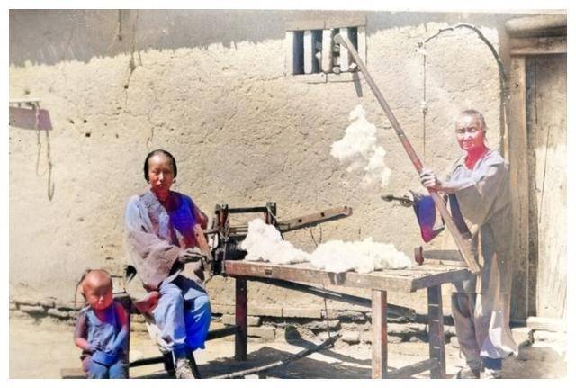 还有一张照片,展示了两位妇女正在弹棉花。弹棉花曾是每个家庭的必备技能,而现在,这项手艺几乎已经消失了。那些年,家家户户都需要自己制作棉被和衣物。那时,弹棉花不仅是家务,更是一项必不可少的生计技能。