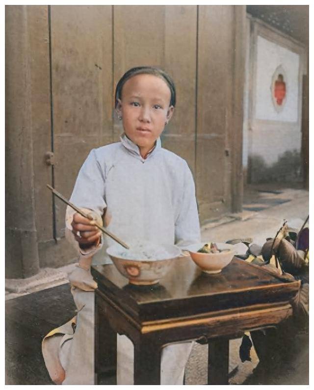 晚清时期的女孩坐在桌前准备吃饭,餐桌上的饭菜看似平常,但在那个时代,它代表着一种不小的富足。那时的平民百姓,连温饱都成问题,能吃上这样的一餐已经不容易。贫穷和富贵之间的差距,显而易见。
