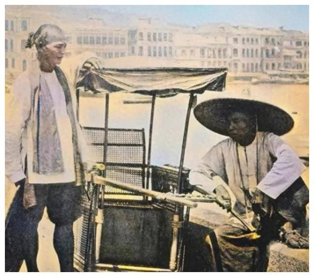 两位轿夫正在路边休息,背景中是连成一线的三层楼房,似乎是江景房。这一幕,让我不禁想到,当时的城市与乡村是怎样的景象,而这些轿夫,背负着重重的担子,也曾是城市中的一部分。