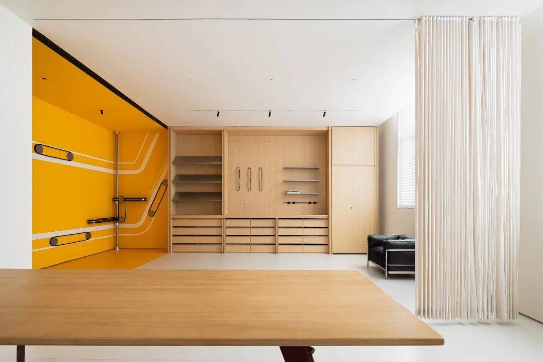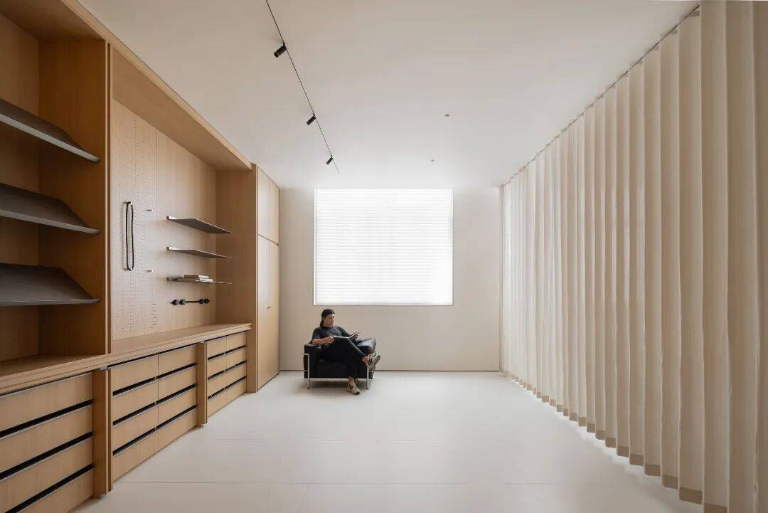 办公区和展示区 另一侧较大空间则整合为主展示区与开放办公区,为了兼顾空间的连通性与私密性,两区之间采用半透布帘作为软隔断,既能够在办公时段保障办公区域的相对独立,减少展陈动线的干扰,又可根据接待、活动等使用需求灵活开合,让空间在 “办公模式” 与 “展陈模式” 之间自由切换,在空间面积受限的前提下,实现了空间价值的最大化利用,让实用性与灵活性兼具。
