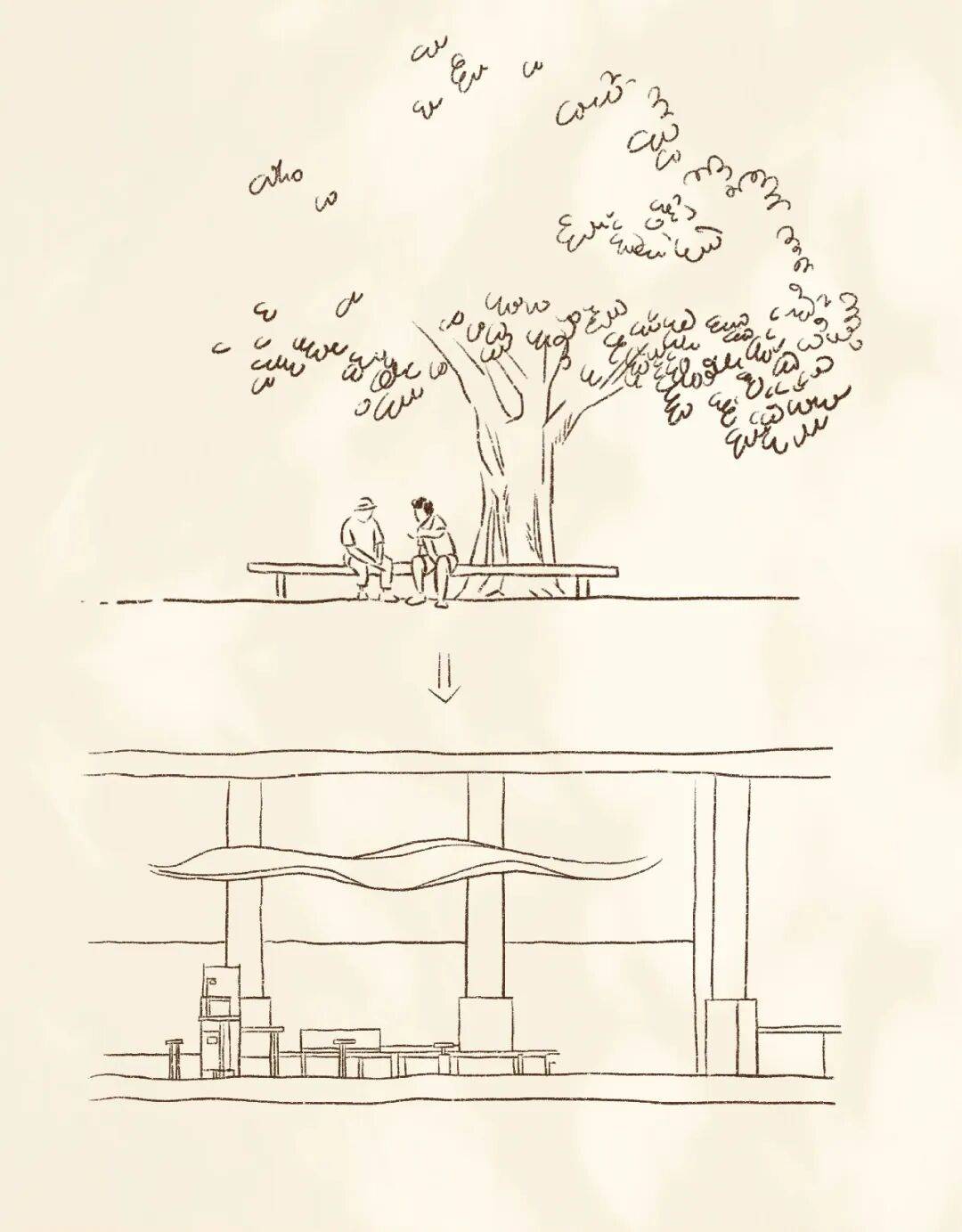 门店中心的客座区,以传统的“竹榻”为灵感原型,与顶上的竹编元素遥相呼应,纳凉弈棋趣,聊闲话家常,营造“大树底下好乘凉”的快活闲适。