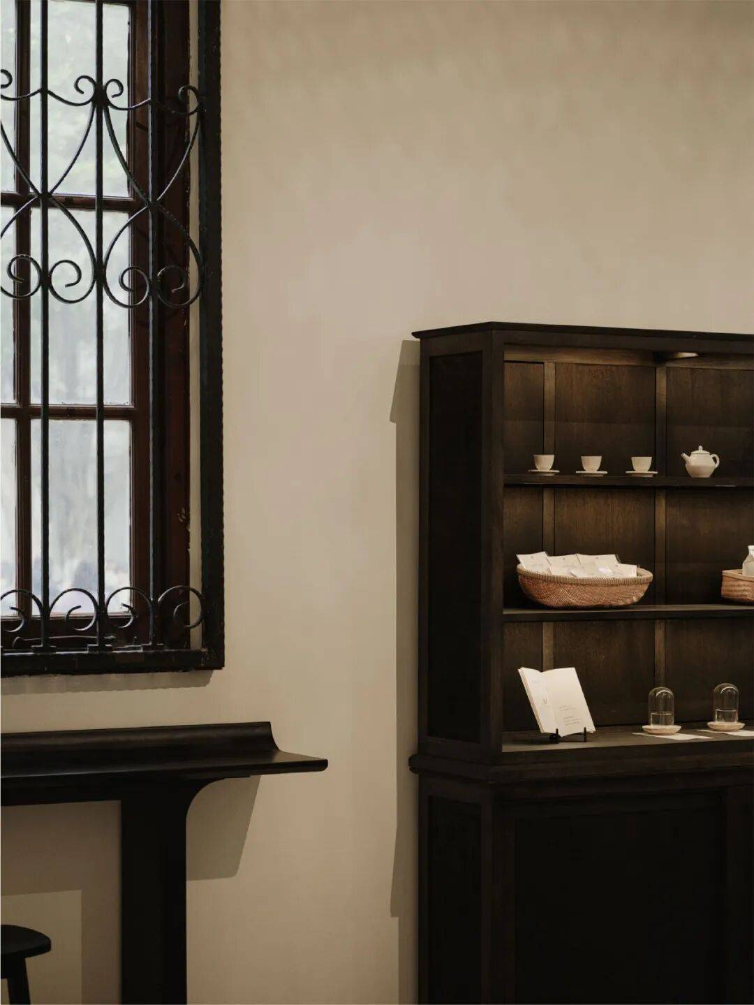 茶叶闻香装置和茶具有序陈列在旧家具改装过的柜台中,新旧交融之间,既保留了岁月的痕迹,也赋予了空间新的使用可能。