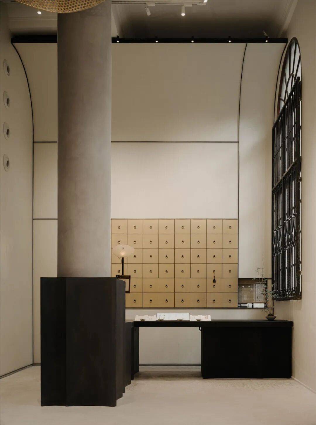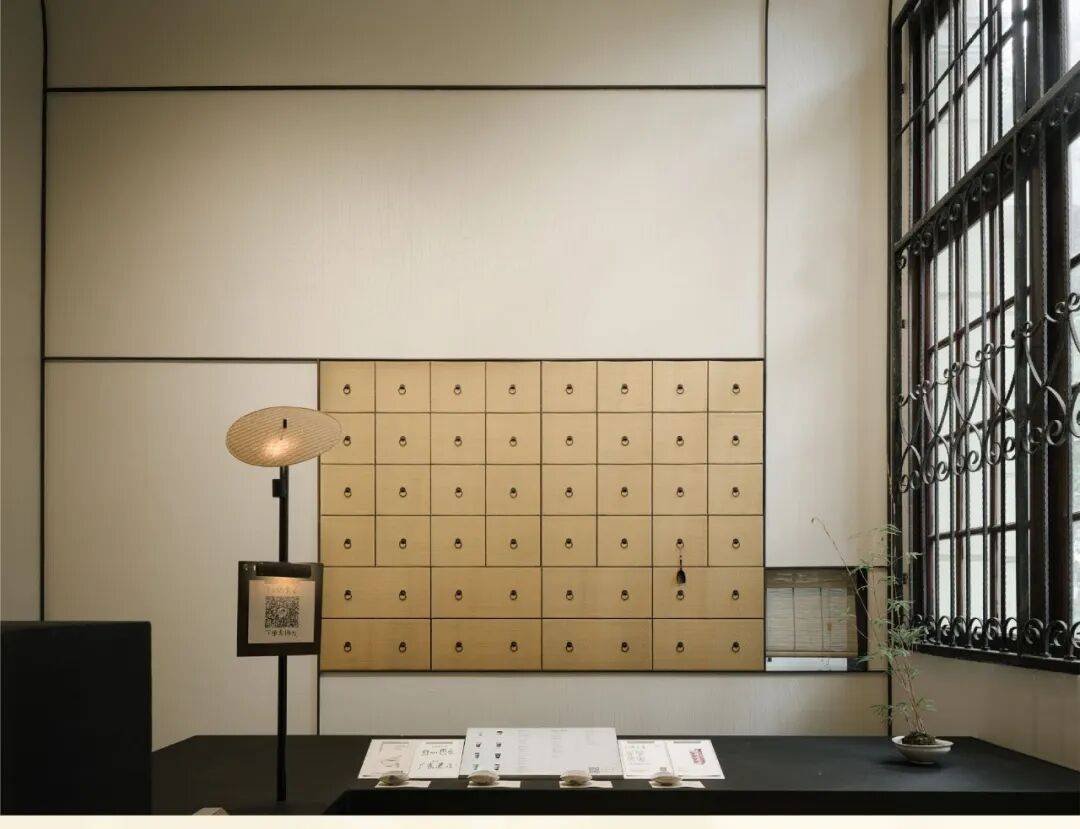 吧台打造成草本茶铺的模样,结合广式凉茶的养生特色,营造独特的茶文化氛围。后方竹编百子柜则选用可回收的旧柜拉环进行组合,细节之处,再次强化空间记忆。