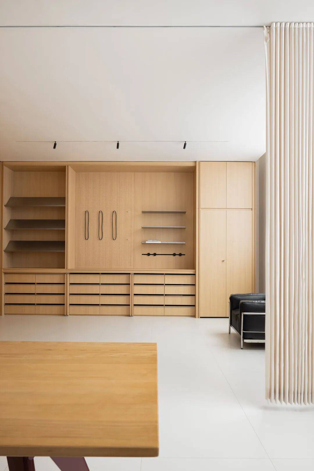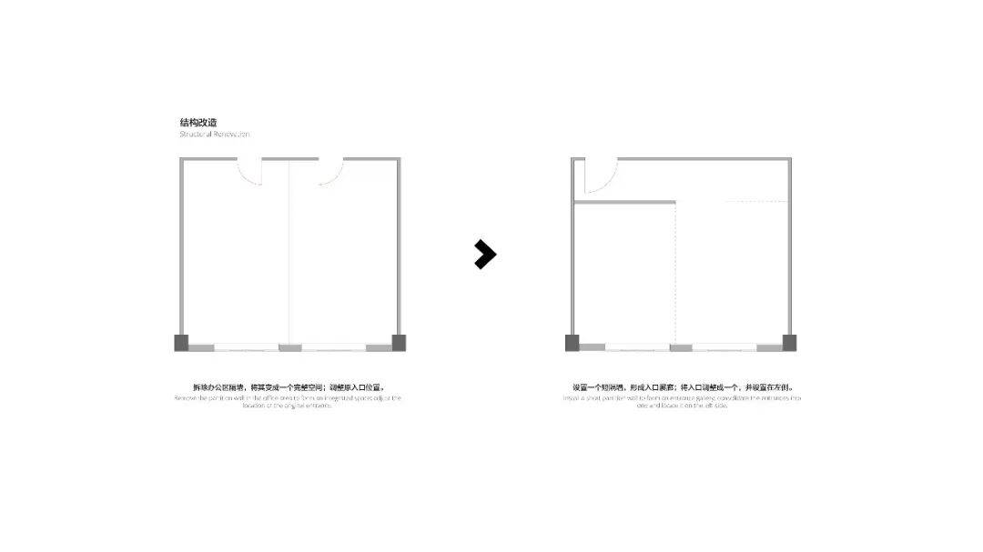 展示空间-分隔状态 本次设计以 “最少动作解决核心需求” 为核心策略,摒弃复杂的空间改造手法,用简约却精准的设计巧思,让有限空间释放多元功能,在方寸之间构建出动线流畅、功能清晰的复合场域,既契合企业的日常办公,又满足品牌的展陈需求。 空间营造的关键,在于用极简的设计手法实现功能的自然划分与有机融合。我们以入口区域的片墙为空间界定的核心载体,将 50㎡的空间利落划分成两大功能板块。