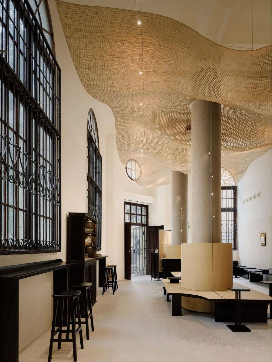 为最大程度保护原历史建筑的完整性,立品团队采用立面包墙的做法,在新增墙体内置入天花支撑钢架结构,以空间内的两根大立柱为主要受力点,完成竹编天花的吊挂与灯具的安装。
