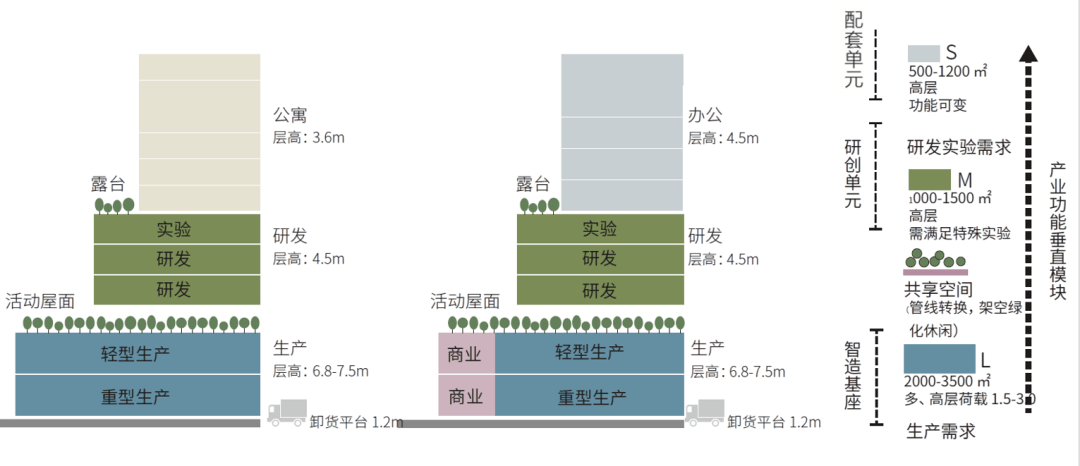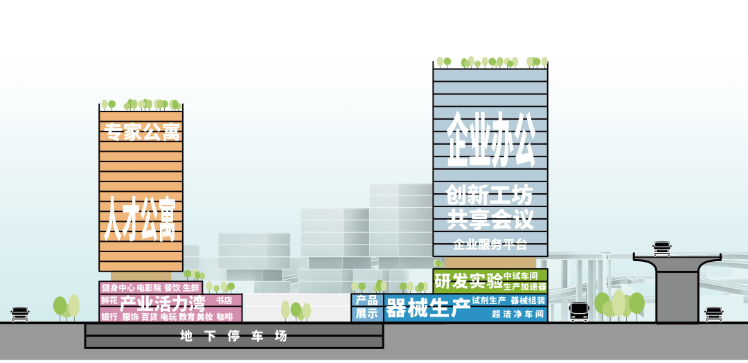 剖面/垂直功能布置示意 垂直分区不仅显著提升土地利用效率(在6.7公顷用地上实现约2.6容积率),也构建出“上下游协作、楼上楼下联动”的产业生态,使生产、研发与转化在空间上紧密耦合,成为“工业上楼”模式的典型实践