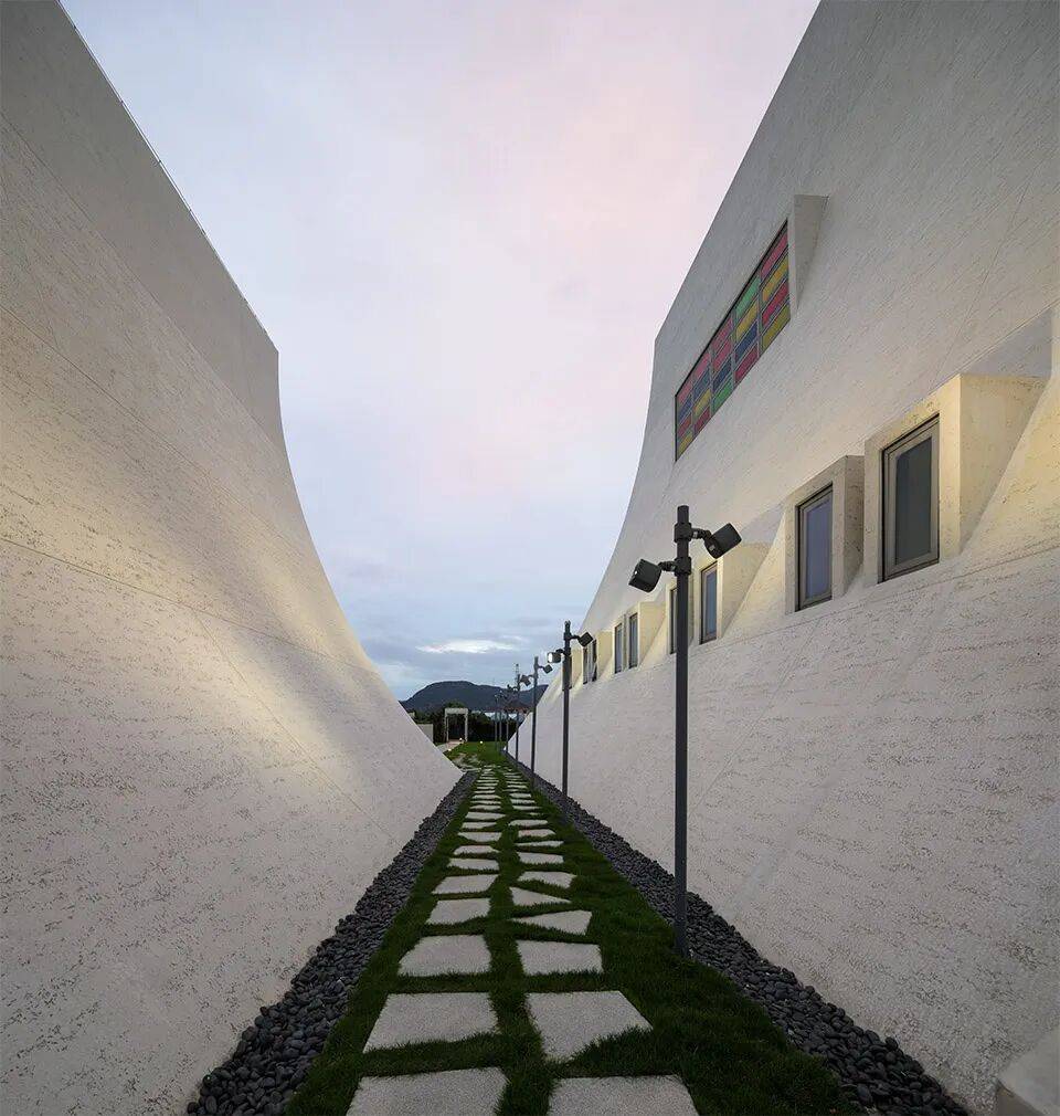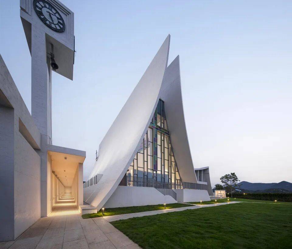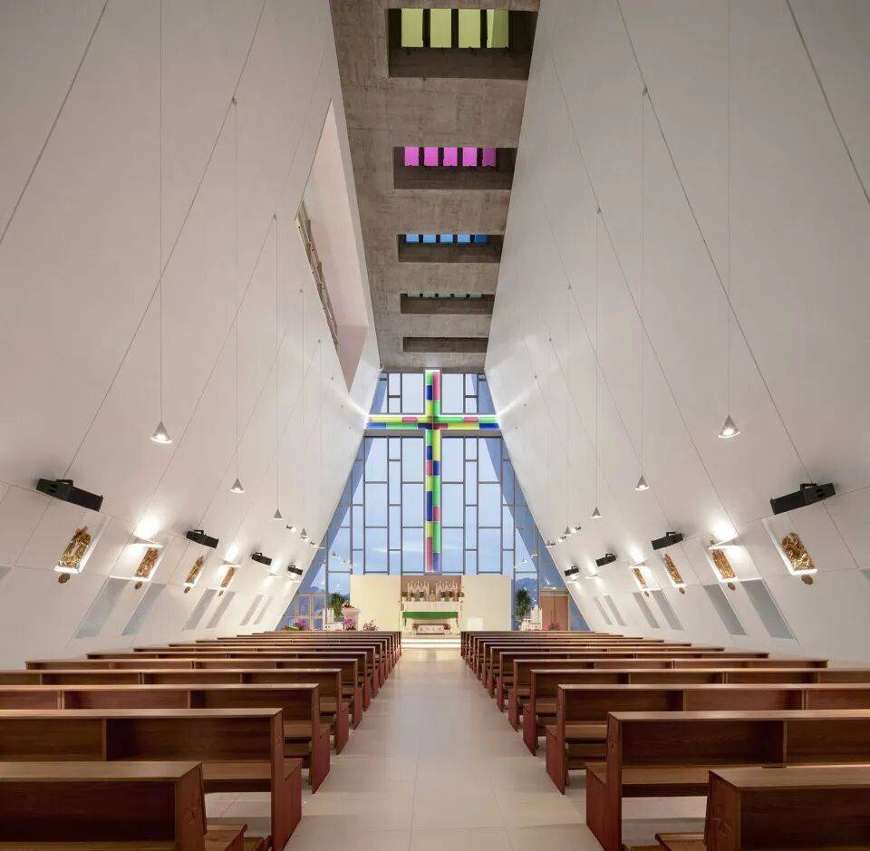 ▲顶部彩色玻璃天窗© 黎伟 建筑形态以现代建构语言回应场地与文化双重属性,摒弃传统宗教建筑的固化形制,将哥特式的垂直动势抽象为昂扬舒展的白色风帆形态,以倾斜交错的动态体量,形成与远山沉稳轮廓的哲学性张力对话。白色纯净材质强化建筑在田野与山海间的标志性,同时回归现代主义“材料本真” 原则,以简洁材质凸显空间与形态的本质美感。