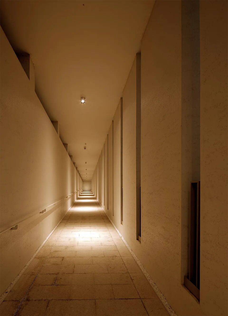 ▲狭长、幽暗的压缩性过渡空间© 黎伟 来访者沿田间小路步入场地,首先以钟楼作为精神序章,随即进入狭长、幽暗的压缩性过渡空间,通过尺度收束与光线弱化完成心绪沉淀;伴随地面逐级抬升,光线渐次明亮,空间尺度悄然转换,经转折抵达主教堂入口,高大拱圈与铁门形成视觉高潮,预示神圣空间的开启。