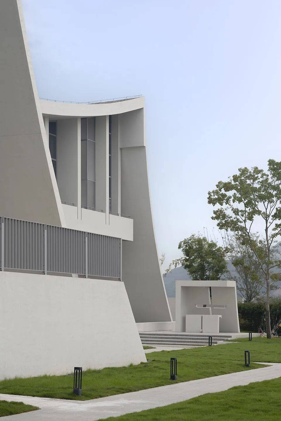 ▲教堂外观细部© 黎伟 仪式感的系统性塑造,是设计回应“朝圣式抵达” 的核心策略,亦是现代主义 “空间叙事引导精神体验” 的具象实践。区别于传统教堂以立面符号直接彰显神性的路径,本案以渐进式路径序列完成从尘世到神圣的心理过渡,重构现代宗教建筑的仪式逻辑。