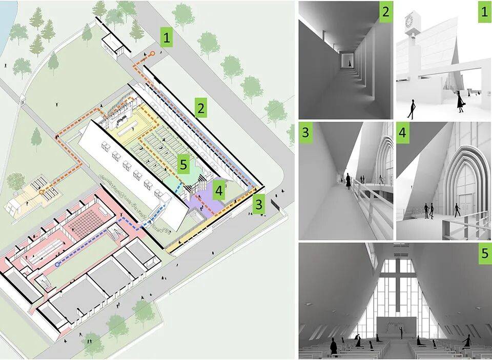 ▲乡村鸟瞰© 黎伟 场地位于海边田野之中,旷野开阔、群山环伺,自然地貌赋予场地原生的静谧性与精神性。设计以“田野之帆,心灵之舟”为核心理念,以现代主义建筑语言完成对传统宗教形制的抽象转译,摒弃复古符号的表层复刻,以功能理性、材料本真、空间叙事、场所共生为底层逻辑,构建兼具在地性与当代性的现代神圣空间,践行现代主义教堂 “从装饰的神圣到建构的神圣” 的核心建筑学命题。 ▲功能流线© 中国美术学院风景建筑设计研究总院有限公司