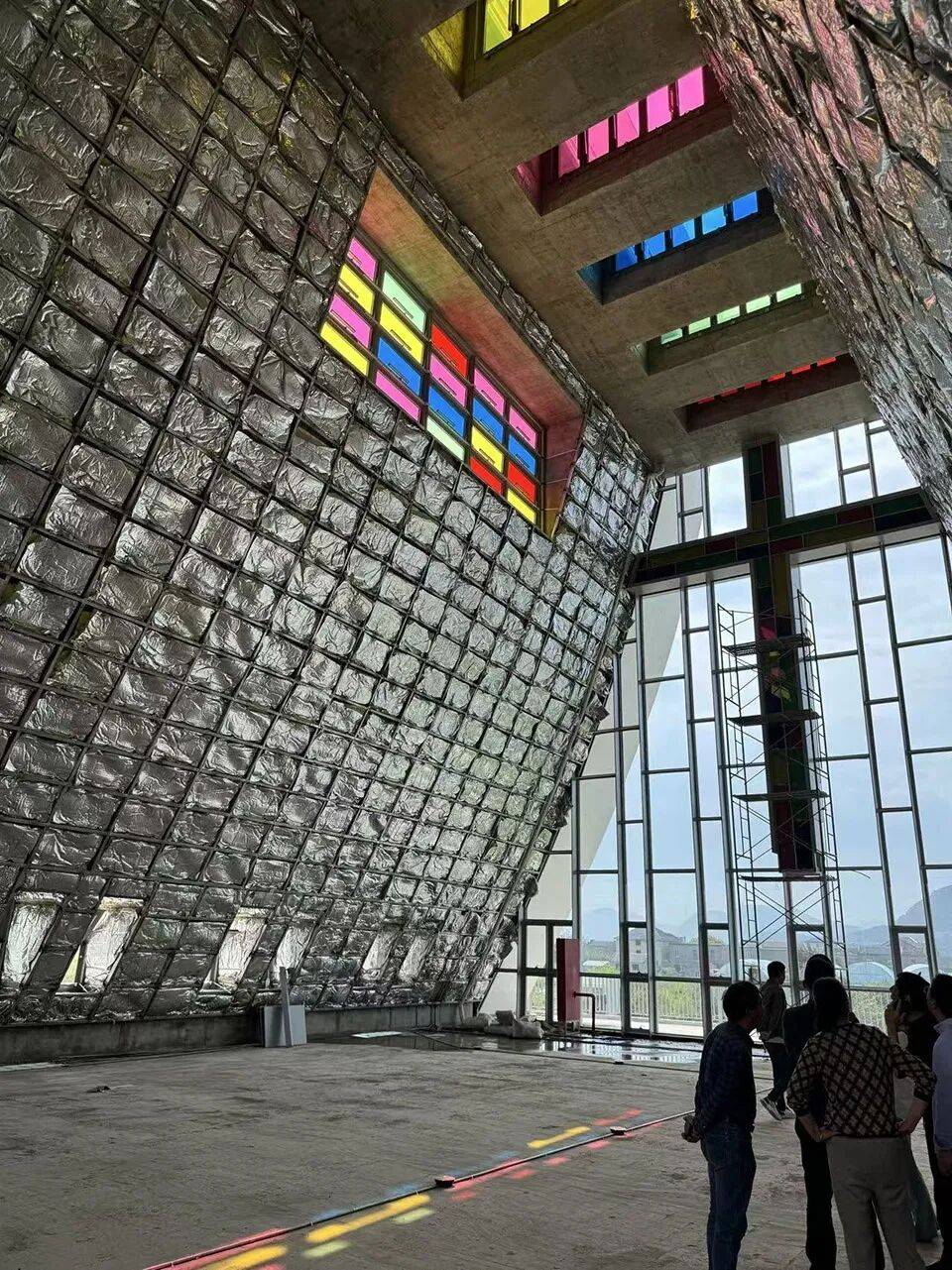 ▲主厅空间© 黎伟 内部空间设计,是对哥特式建筑精神的现代主义抽象转译,突出其垂直向上的精神动势与天光叙事的本质内核。主厅采用无柱纯净空间体系,以极简线条实现向上收分的空间形态,最大化消解结构干扰,凸显空间的纯粹性与升腾感,以建构逻辑还原哥特建筑“垂直飞升” 的神性表达。光线成为空间的核心叙事媒介,主面的玻璃幕墙、顶部彩色玻璃天窗和高侧窗形成多层次采光系统,自然光穿透玻璃洒落地面,让整个空间成为 “光的容器”,以光影的流动与变幻塑造神圣氛围,延续朗香教堂 “光即神性”、光之教堂 “光影建构精神” 的现代主义脉络。圣坛后方整面玻璃悬挂的巨型彩色十字架,巧妙融入主体结构,以悬浮的光之符号成为视觉与精神核心;侧墙点缀的彩色玻璃窗,在日光下形成跳跃光斑,与主十字架形成呼应,以极简的视觉符号完成宗教精神的转译。
