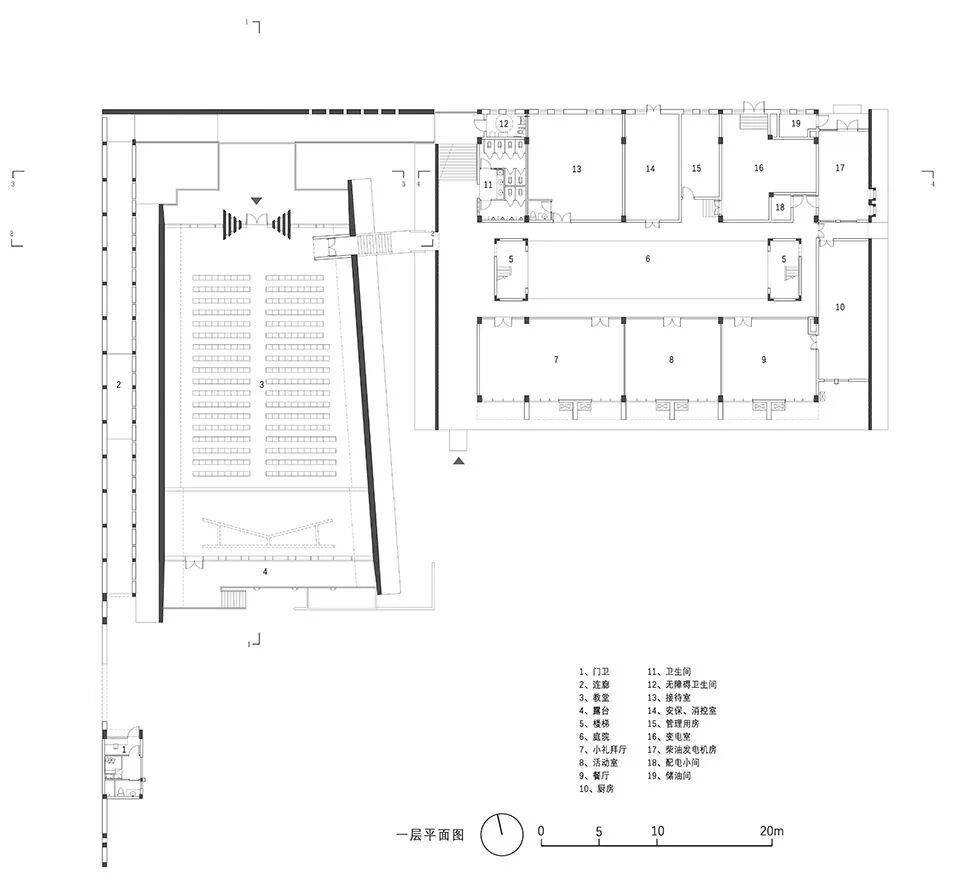 ▲昂扬舒展的白色风帆形态© 黎伟 室外讲台作为室内仪式功能的外向延伸,联动辅助用房首层公共空间、户外草坪与原生乔木,构建多元化、开放式的聚会场景,打破传统教堂“内向封闭” 的空间属性,践行现代主义教堂 “从内向祈祷到外向包容” 的转型理念,让宗教空间融入乡村公共生活,实现精神功能与社会功能的统一。