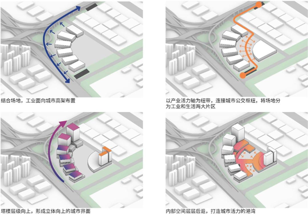 “高架下、球场边”的人性化园区 与此同时,项目还需在“人货分流”的高效组织与“产城联通”的空间连续之间取得平衡。这一系列挑战与回应,共同构成了项目从理念走向落地的关键脉络。 策略与创新 “立体生长”的产业园区 “产业活力湾” 根据周边城市环境,设计将地块清晰划分为生产区与生活区:生产区沿城市主干道呈扇形展开,形成高效、独立的货运交通体系;生活区则布置于场地可达性与可见性最优的界面,强化城市展示属性。