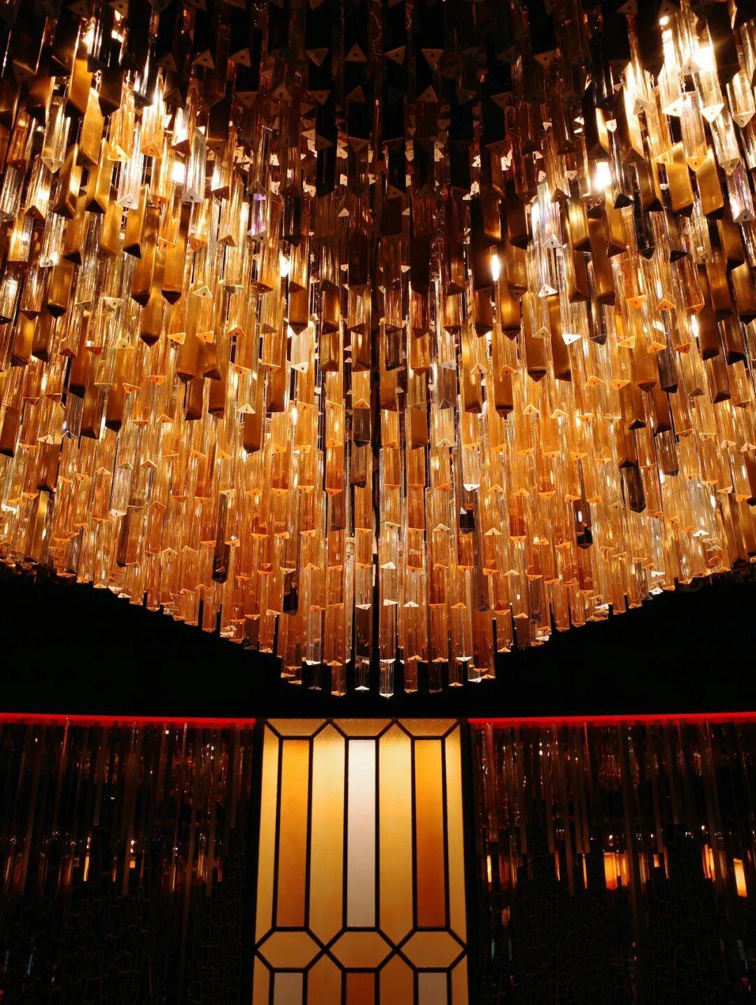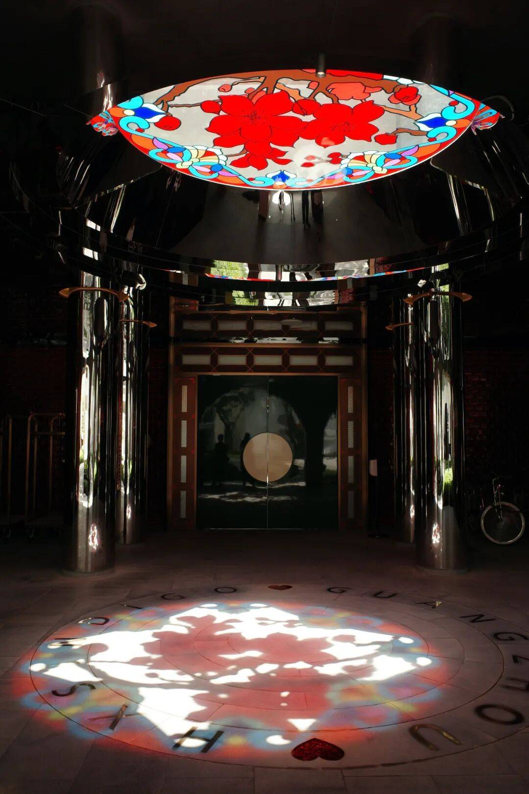 圆形穹顶上一幅巨型彩绘玻璃花窗,倒映在一层地面上,木棉花窗闪烁,在灯影中投射涟漪。广州的市花只有一种,是木棉,又叫红棉,它是广州的重要标志,代表着广州市特有的精神风貌和文化底蕴。