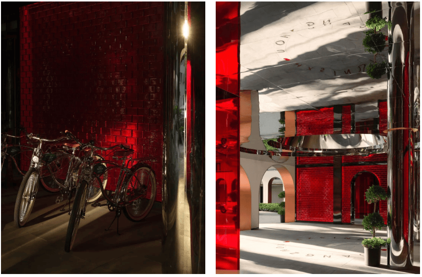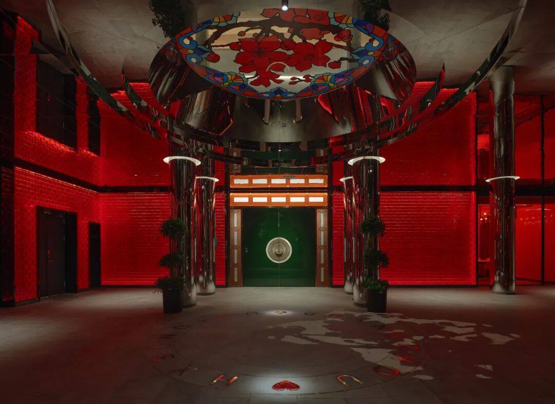 入口门厅汲取了岭南水乡文化与海心沙的独特风情,猎德村的邻里文化被用作灵感来源,鲜红的水晶砖入口,寓意酒店开门红,翡翠绿的门扉、不锈钢的立柱、海心沙的爱心,与素白色的外立面形成极强的视觉冲击,显现新派国潮风与岭南元素的交织的演绎。