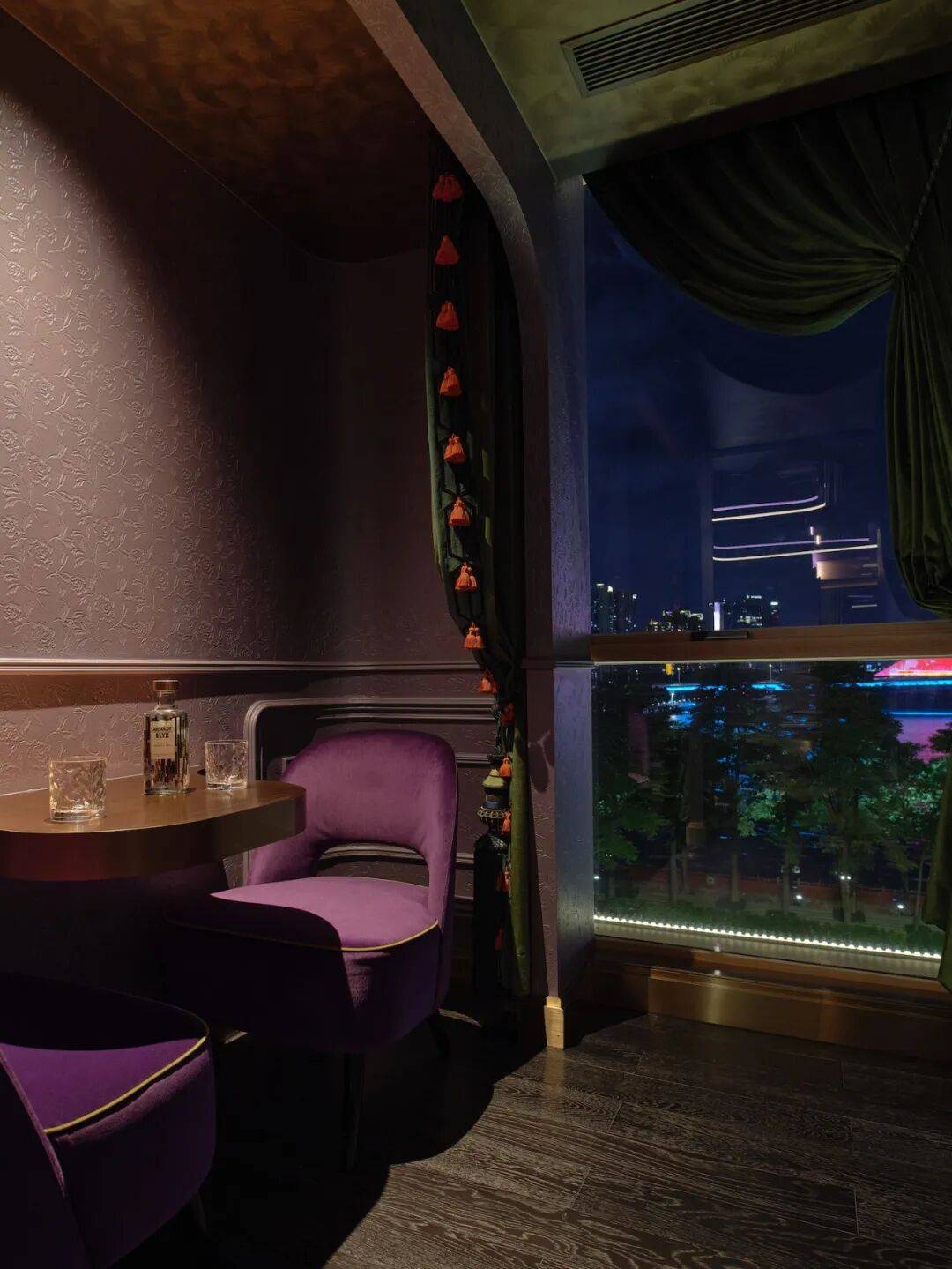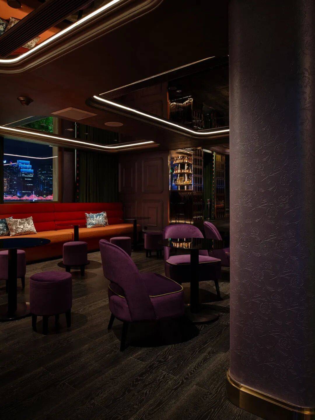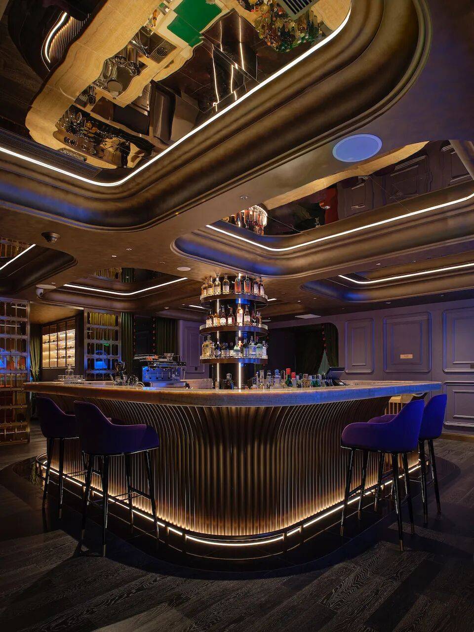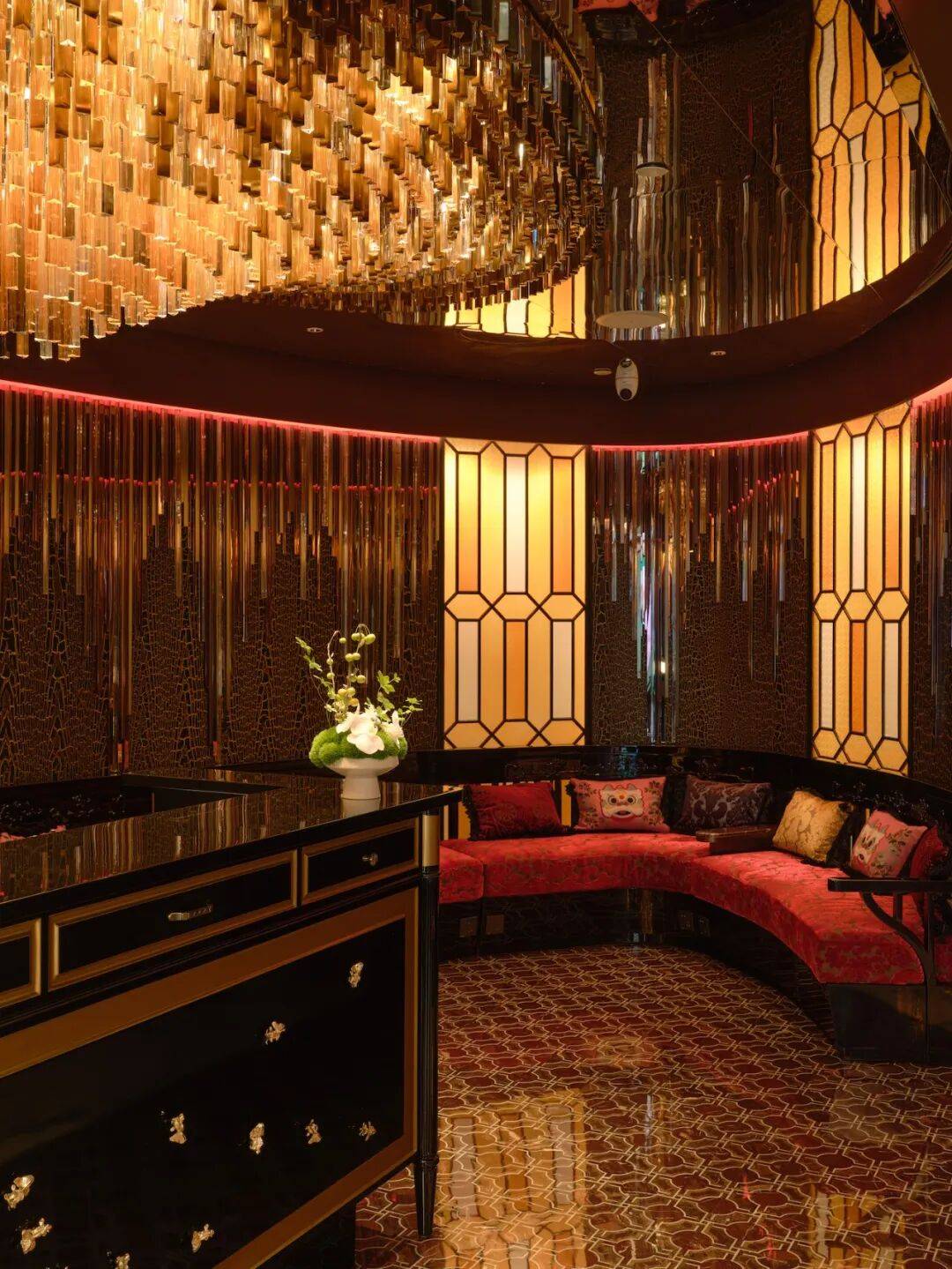 「光点」屋顶酒吧位于主楼顶部六层,一面的LED墙面让空间更加迷离与梦幻,独立式岛台为调酒区域,镜面吊顶下,是鸟笼状的下午茶器皿,现代电子风格与旧时岭南宅邸在这个空间融合得恰到好处。