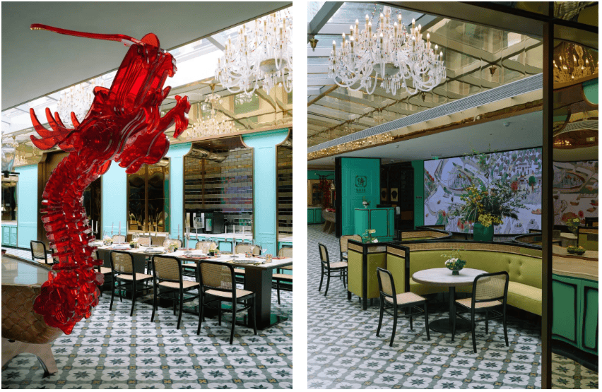 03. 寻味「邻间」 邻里餐厅「洀 SAIL」的设计充满浓郁的岭南风情,进门的龙舟造型食物摆放台、参天榕树、猎德龙舟、粤语字符等等文化符号,重现了广州邻间街坊的热闹非凡。