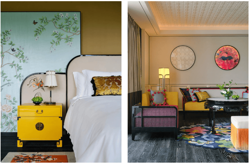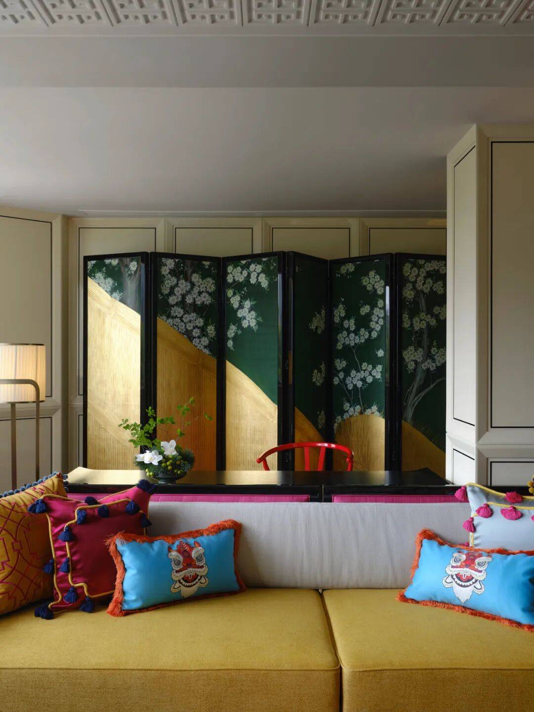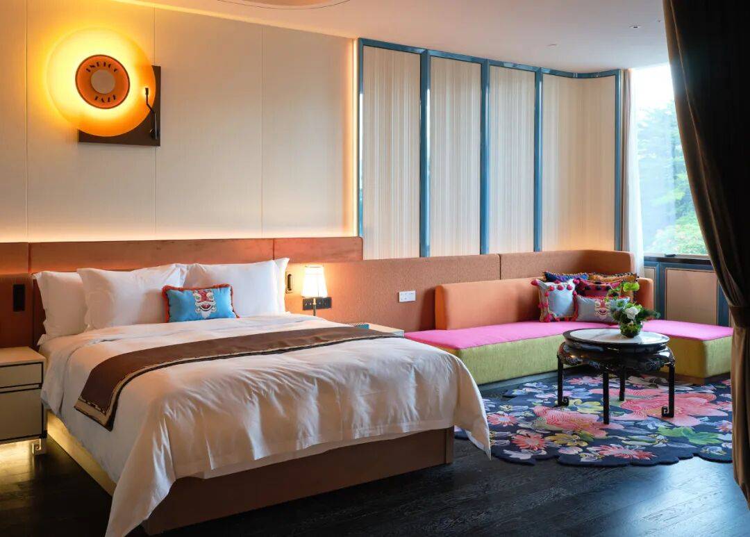 房间用配色很大胆,以城市花园与海心乘韵为灵感的设计主题,沙发以卧榻的形式呈现,茶几是传统的岭南小圆桌,抱枕上绣着醒狮图案,地毯更是花开烂漫,满洲窗、骑楼花砖,甚至粤剧老戏台(仅限剧院豪华精品客房)等元素悉数融入,丰富的色彩与特色艺术品带来强烈的视觉冲击,细节之处连冰桶、纸巾盒都是岭南熟悉的荔枝图案。
