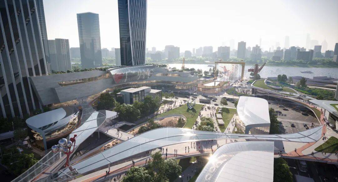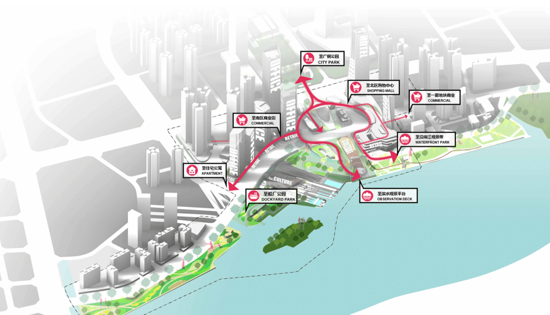 24小时城市连廊 整体设计包含多层地下空间。通过地下一层及地下二层的人行流线,串联地铁站、船坞博物馆、图书馆、演艺中心等地下文化设施,打通船坞南北两侧的商业空间,形成地下完整的步行环线,激发空间商业活力。 而在地上空间也设置了多层级串联,通过包括跨道路公共连廊、公共平台以及商业平台在内的24小时城市连廊系统,搭配竖向交通节点,将地面人流引向地上,营造出全天候舒适的步行环境,实现各商业层次和商业空间的便捷通达,面向江流构建多层次退台立面,最大化江景利用,强化商业活力氛围。此外,设计在地面打造了自行车慢行系统,营造绿色低碳且全龄友好的多维慢行体系。