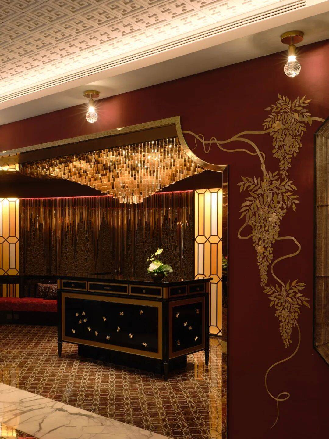 礼宾区天花板的垂状水晶灯,宛如大榕树根下阳光洒落,为空间增色不少。墙面则以多种材料巧妙拼贴,勾勒出一幅幅美好画面,仿佛一家人置身于榕树下的夏日乘凉。