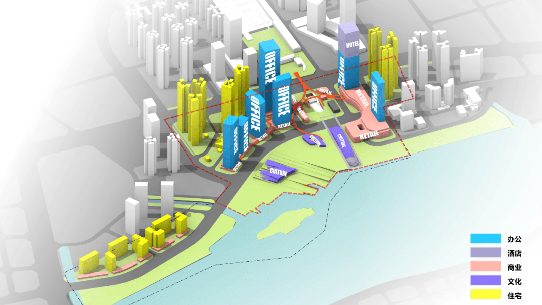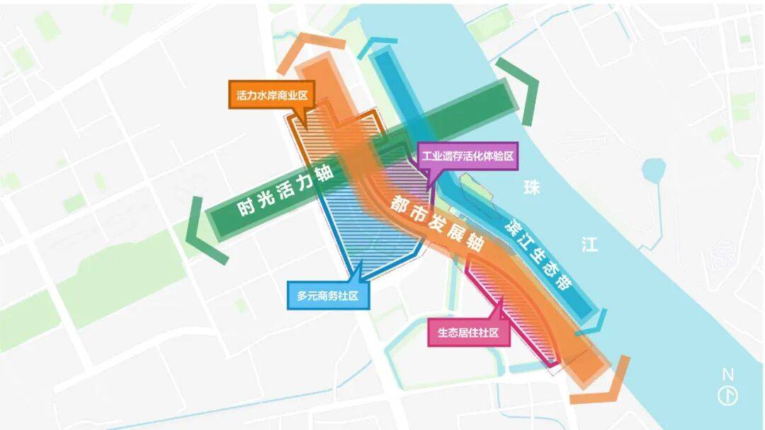 江岸空间关系 面对不规则且被规划道路割裂的地块,团队采取了“两轴一带多区”的区域空间结构:依托基地狭长的轮廓,构建了南北贯穿的“都市发展轴”,并基于城市绿轴打造了东西向的“时光活力轴”。 复合的社区空间围绕相交的轴线错落布局,形成了活力水岸商业区、多元商务社区、工业遗存活化体验区和生态居住社区等多元特色分区,设计充分利用珠江沿岸空间,营造滨江生态带,与绿轴相互呼应。
