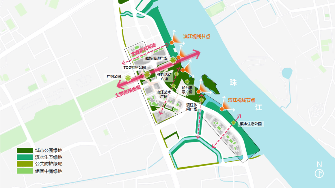 整体鸟瞰 团队从珠江水韵形态中汲取灵感,结合场地空间骨架以及城市空间节点,提出了“观潮湾”的规划概念。整体设计基于业态立城、超链连城、绿潮漫城的三大策略,在回应拥水而居的绝佳生态环境的同时,形成了“珠江赏观”“粤动绿潮”“数字港湾”的主题系列,以集生态城市公园、数字产业新经济、文化娱乐新风尚的复合型城市开发区,构建引领未来滨江城市发展新范式。