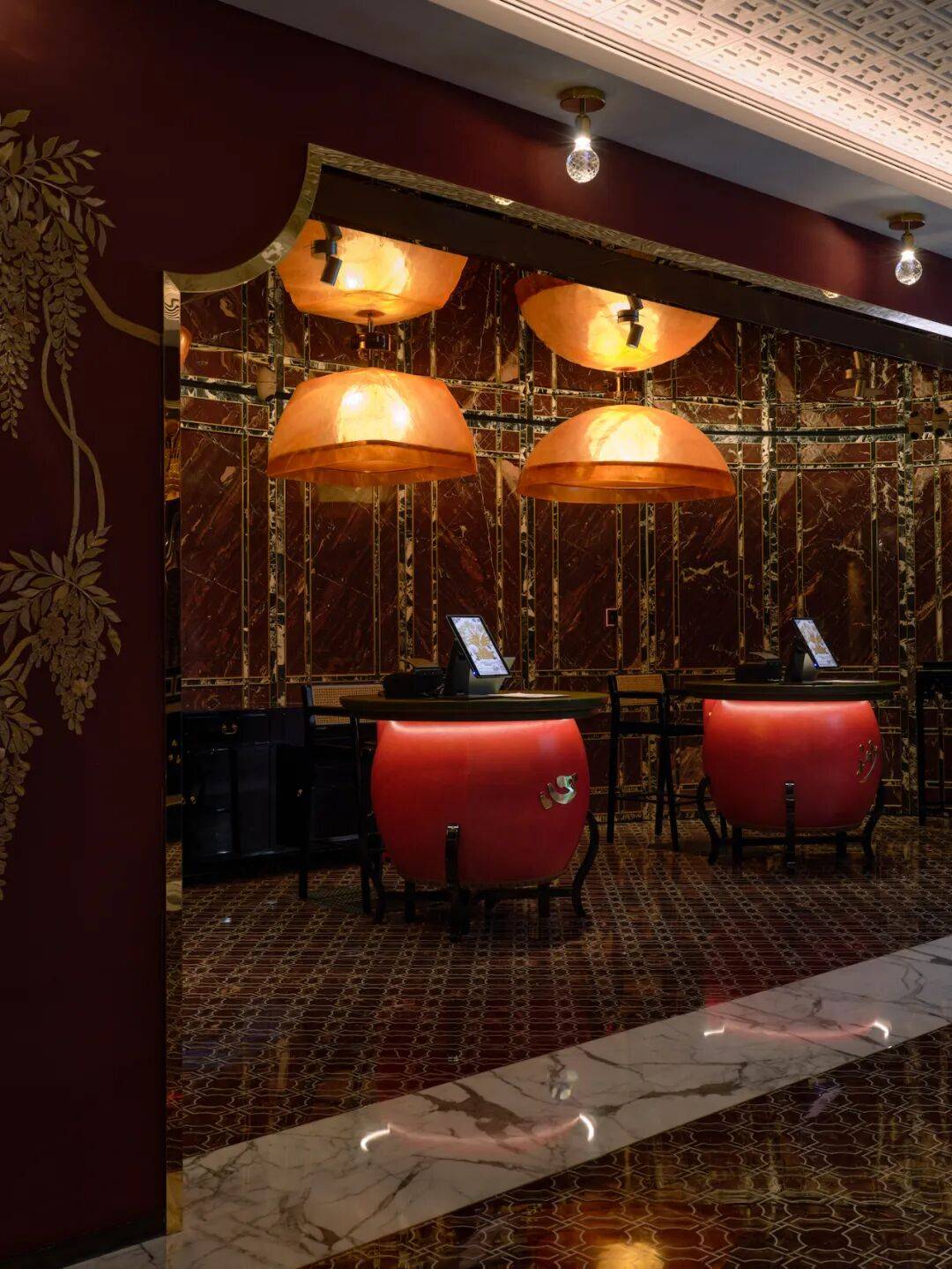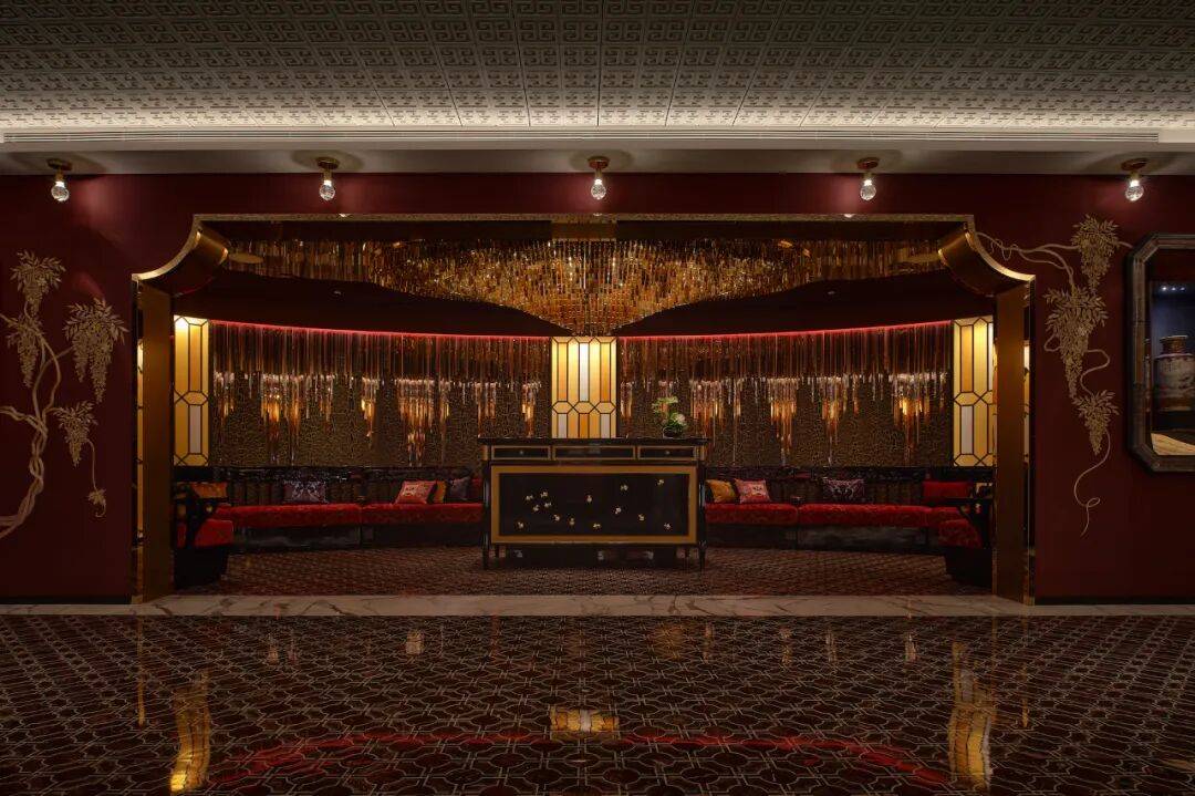 位于主楼二层的「潮」酒吧设计上展现猎德涌与珠江的波动,充满时尚活力。大面积的墙面和吊顶饰面描绘体现了酒店的另一设计主题“城市花园”,让微醺的酒客感受暧昧与迷离。