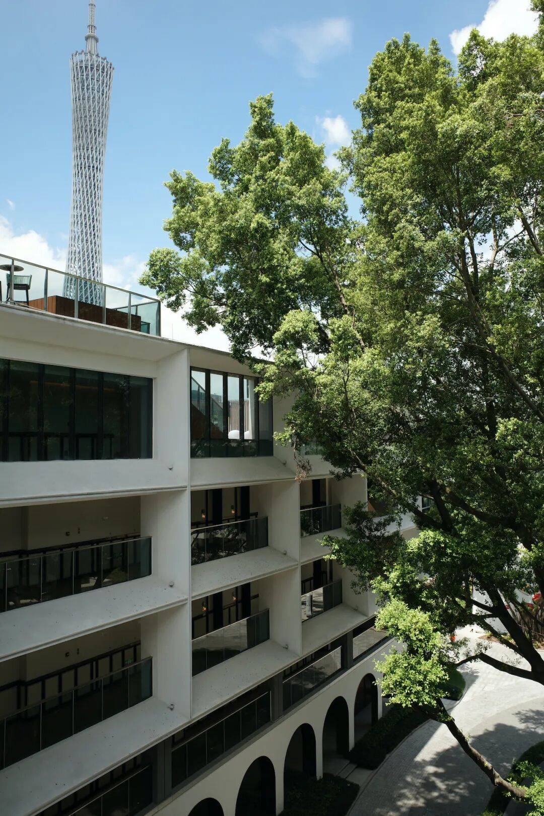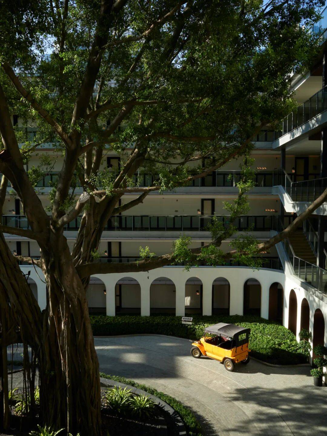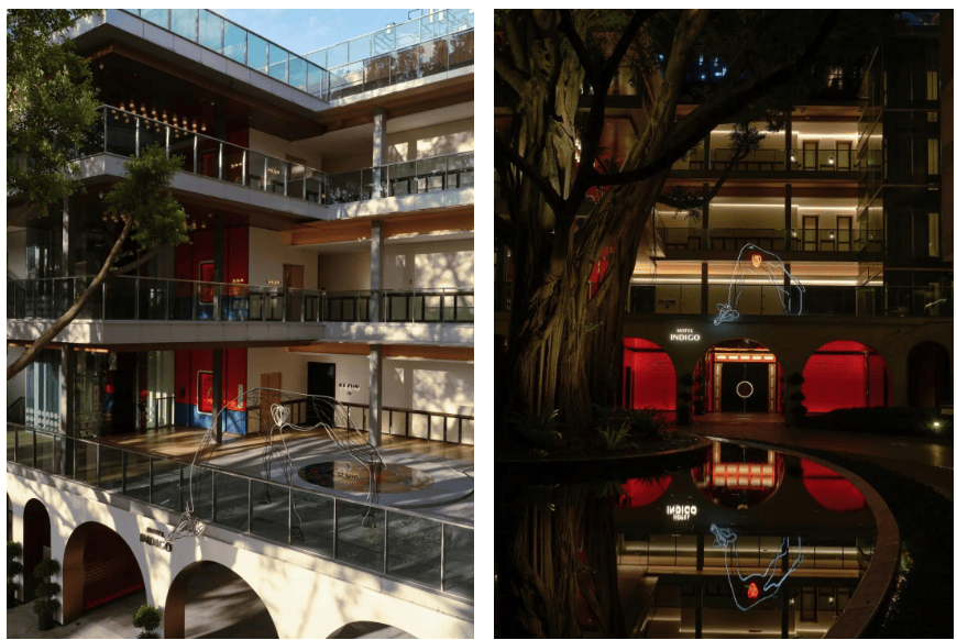 01. 百年榕树下的文化传承 广州海心沙英迪格酒店坐落于海心沙岛东区,由Godfrey Lam团队执掌室内设计大旗,将猎德邻里文化视作无限灵感的源泉,原本平凡的6层海军宿舍经过巧思改造,焕发出崭新的生命力。在这里,岭南地区文化与猎德邻里文化相互交叠,诉说着老广情怀。 酒店区域的大堂门厅前,巍然耸立着一棵枝繁叶茂的巨型老榕树。霓虹灯管长颈鹿雕塑,从二层露台向下伸展出头颈,其闪跳的心脏亦是这座城中绿洲在深呼吸,既是别出心裁的艺术装置,也是妙趣横生的指引。