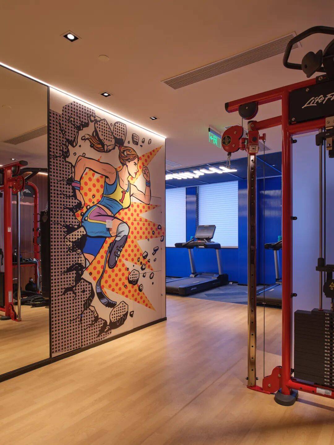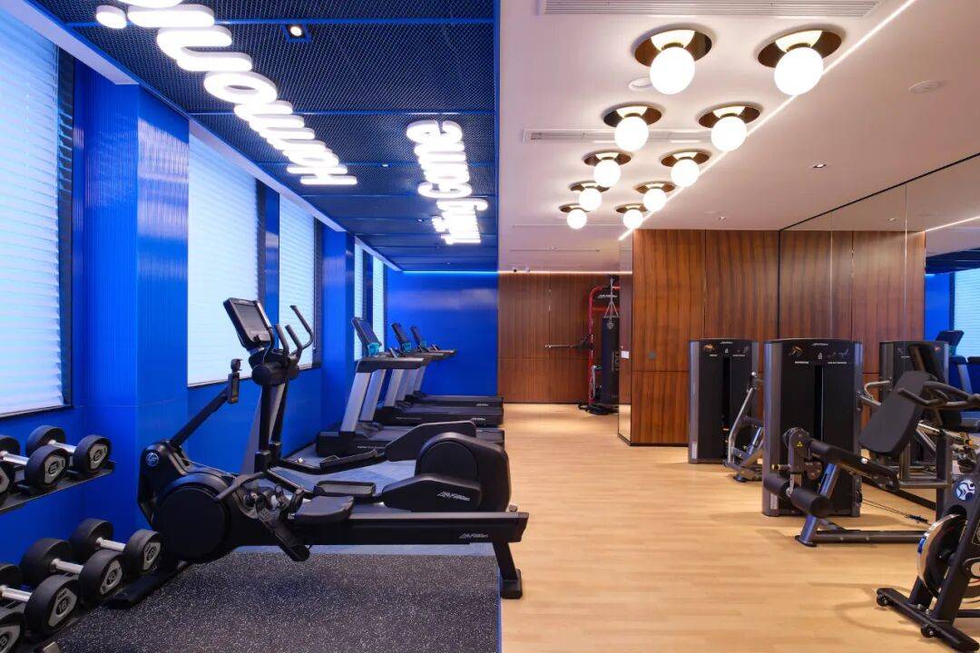 04. 于广州塔下焕活身心 健身中心在以原木为基底的主视觉中大胆融入蓝色、涂鸦和字母灯箱,令人活力焕发。毗邻海⼼沙亚运公园,海⼼沙亚运公园作为2010年亚运会开幕式场地,创造令⼈振奋的开幕式景观,成为融汇运动员、记者和观众的嘉年华。以此为背景的酒店健身房,以活力四射的风格呼应亚运精神。