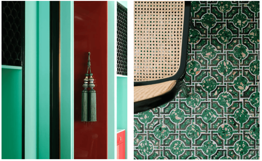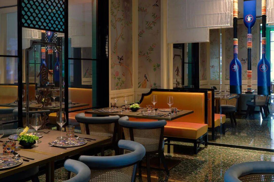 02. 步入静谧之所 进入大门后,便见满地骑楼花砖,礼宾与前台区域分别位于通往餐厅的廊道两侧,这里也是酒店设计上一个出彩的亮点。尤其是前台采用猎德龙舟鼓的造型,三个鼓台分别命名为「海」「心」「沙」,复古但又有新意。