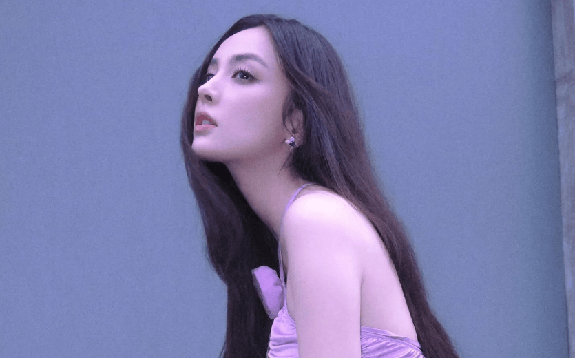她没有选择夸张的色彩堆砌,而是以清透底妆凸显雪白肌肤,再用深棕色调眼影加深眼窝轮廓,让原本就立体的五官更添混血感。眼尾未加刻意上扬的眼线,反而透着几分淡漠疏离,配上浅裸色唇釉,恰似暗夜紫罗兰自带的清冷气质 —— 美丽却带着距离感,越想靠近越觉致命。发型的处理同样点睛:长发被高高束起,露出光洁的额头与修长的脖颈,既避免了发丝对锁骨线条的遮挡,又强化了整体造型的利落感。配饰上她延续了极简思路,没有选择华丽的珠宝堆砌,仅用一枚细巧的金属戒指点缀指尖,举手投足间的光泽与紫色裙身形成呼应,既丰富了视觉层次,又不破坏暗夜氛围的静谧感,恰如紫罗兰花瓣上的露珠,微小却足够亮眼。