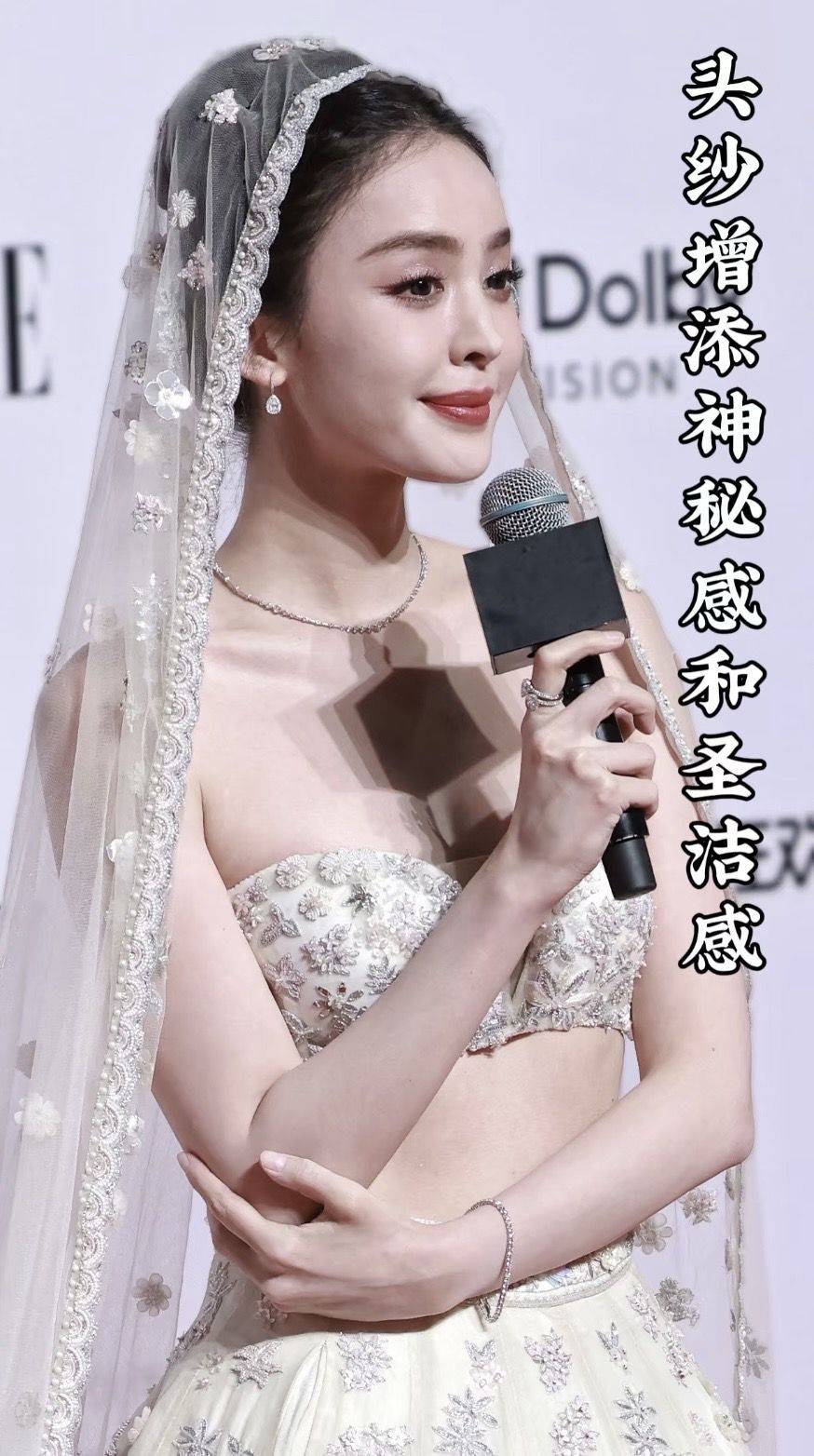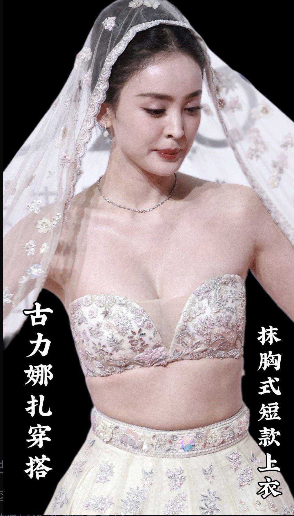 还有她那套抹胸式短款上衣搭配的造型,也超级惊艳。抹胸的设计,把她那精致的肩头和漂亮的锁骨毫无保留地展现出来,性感又优雅。上衣上的花纹刺绣,细腻又精美,就像一幅艺术品,彰显着高贵与典雅。下身的裙子搭配得也十分巧妙,和上衣的风格相得益彰,整体看起来甜美又不失性感。再加上那层薄薄的头纱,一下子就增添了神秘感和圣洁感,让她看起来就像从童话里走出来的公主一样,美得让人移不开眼。
