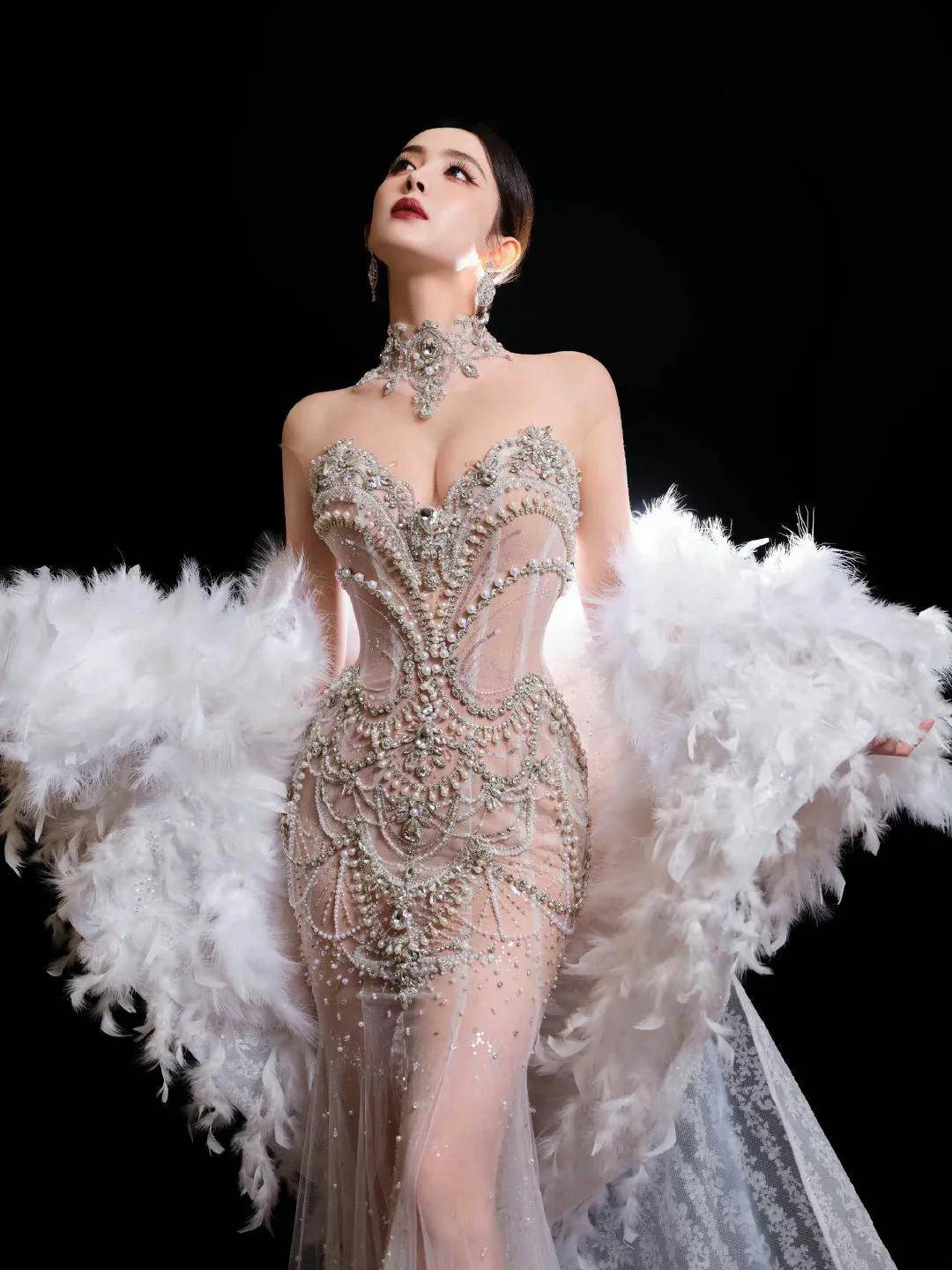 而那套水晶珠宝首饰,更是为整体造型锦上添花,起到了画龙点睛的作用。璀璨的水晶在灯光下闪烁着耀眼的光芒,如同夜空中闪烁的繁星,与黑色礼服相互映衬,形成了强烈的视觉冲击。