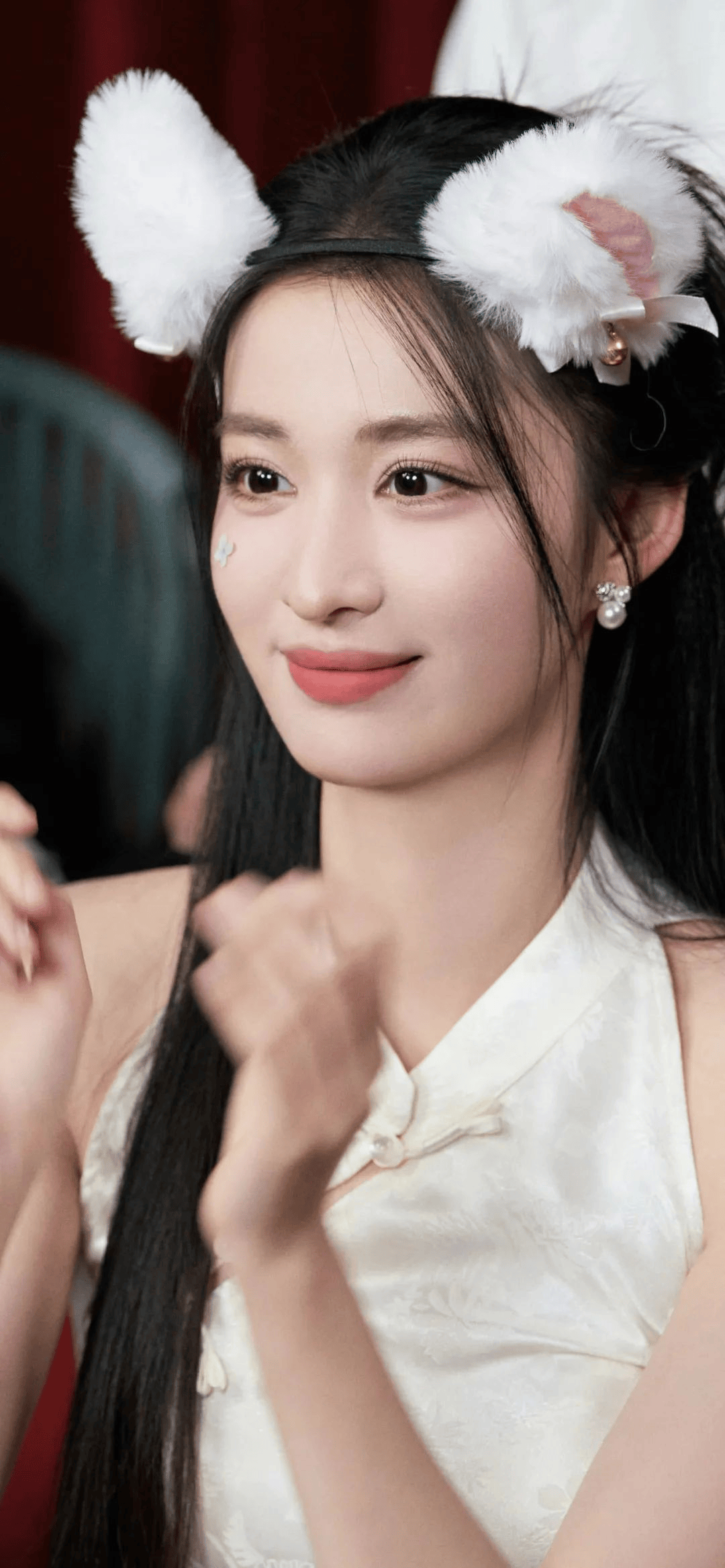 除了礼服裙本身的设计,王楚然的颜值更是为这身造型加分不少。她的脸型是那种标准的鹅蛋脸,线条流畅又柔和,没有一丝多余的赘肉。皮肤白皙细腻,就像剥了壳的鸡蛋,在酒红色的衬托下,更显得光彩照人。