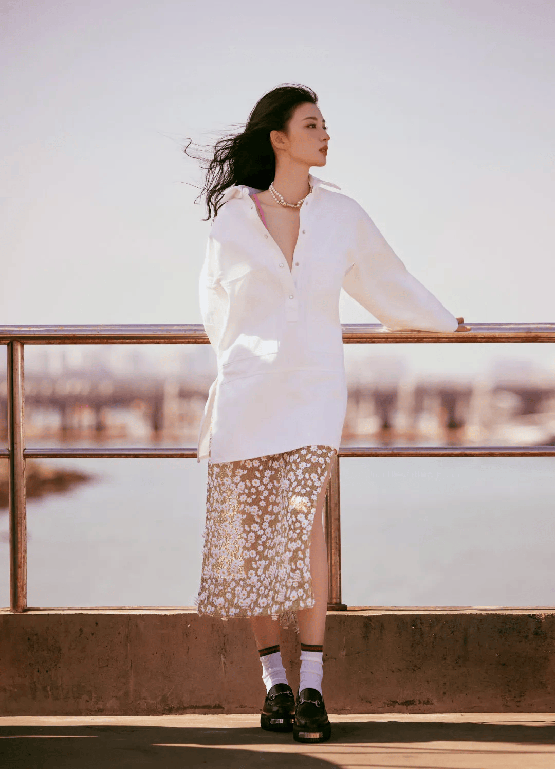 单肩的带子细细的,轻轻搭在她的肩膀上,既增添了一丝性感,又不会过于暴露,恰到好处地展现出女性的柔美。而且,这种不对称的设计还为整体造型增添了一份独特的时尚感,让她看起来既优雅又时髦。