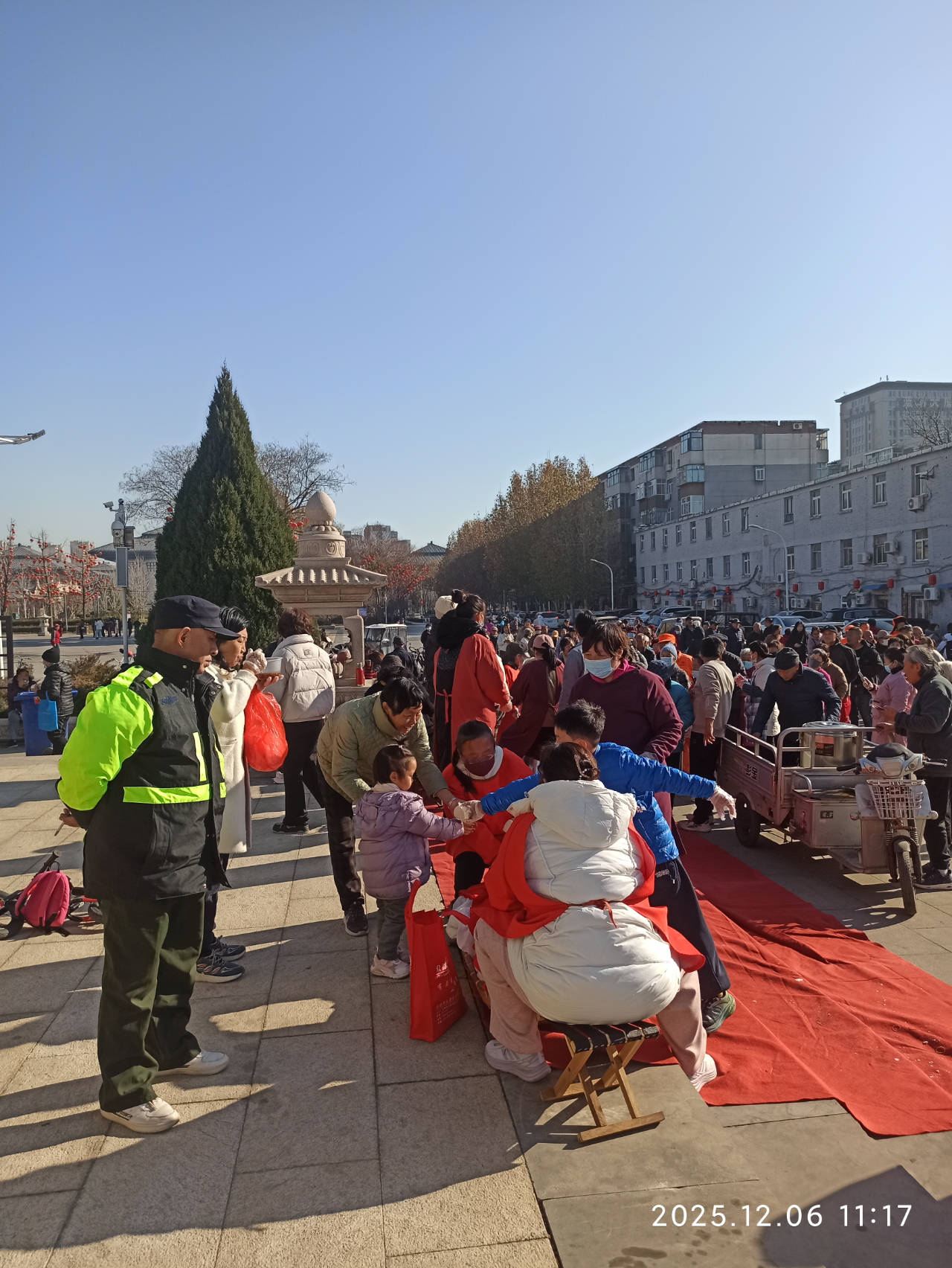 排队过程中,不时有其他老头老太太代替站队的,如此以来,有的大姨就不乐意了,嘴里有些嫌隙。我呢,琢磨着舍斋本身就是免费的,也是爱心,所以,没有放在心上,有人插队就插吧,大不了多等一会。随着排队的人越来越多,工作人员也开始了相应的准备了。有的负责发筷子,有的负责发馒头,有的负责将做好的饭菜端到广场上。等我扭头一看的时候,嚯!人山人海了。