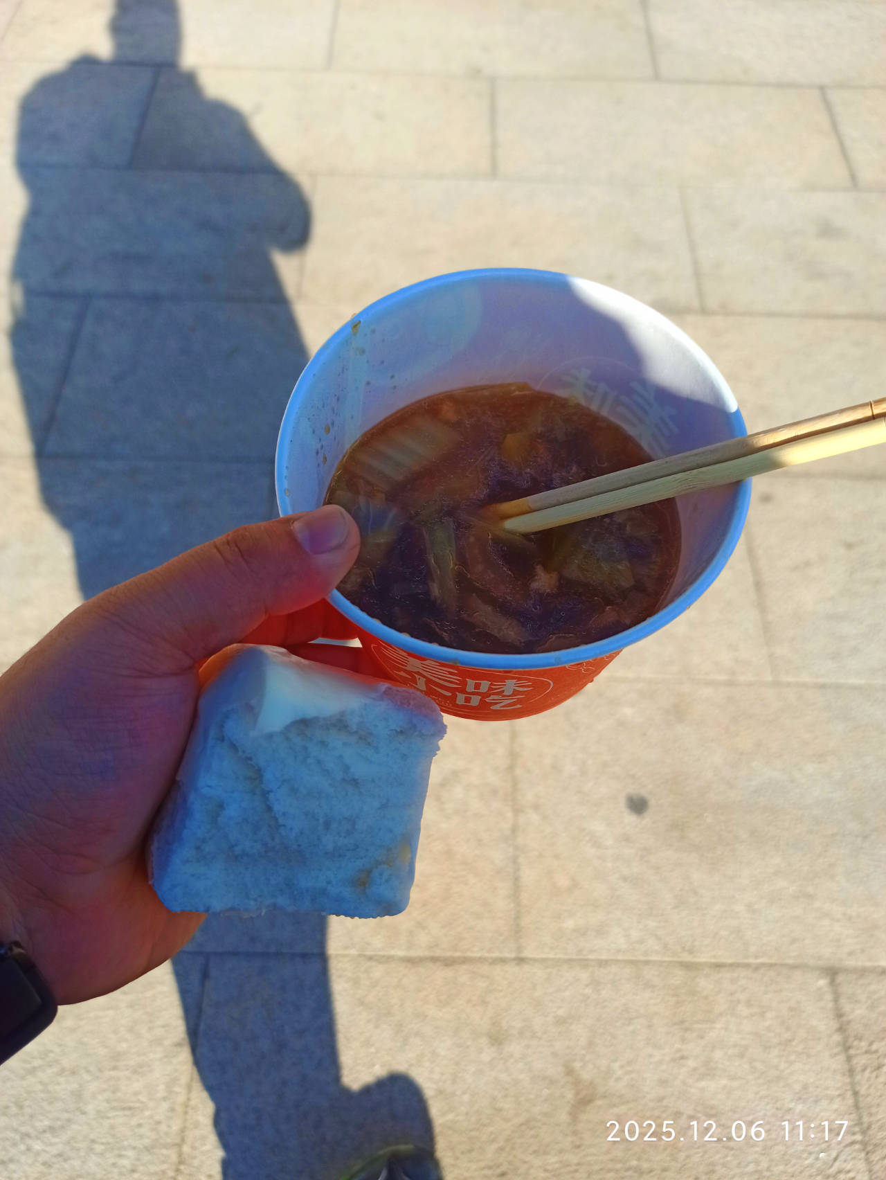 等轮到我的时候,义工老师们将一勺子热气腾腾的素大锅菜递到我手里的时候,我看到碗里有冬瓜、海带、粉条、油炸的豆腐等配菜,香味扑鼻!试想一下,在这个寒冷的冬季,露天来上一碗,好不惬意。馒头虽不大,但是吃着很劲道!重要的是,吃完过后还可以续碗,前提是需要排队续。于是我再次排队,总共吃了2碗素大锅菜,外加3个馒头,可谓是刚刚好,吃的我额头微微冒汗,感觉好极了。