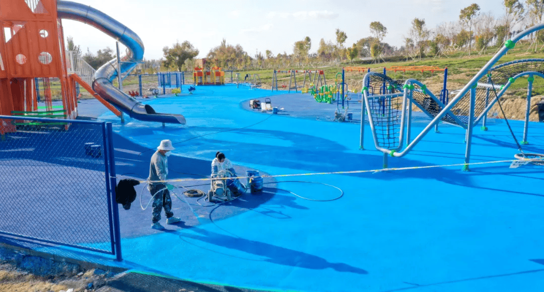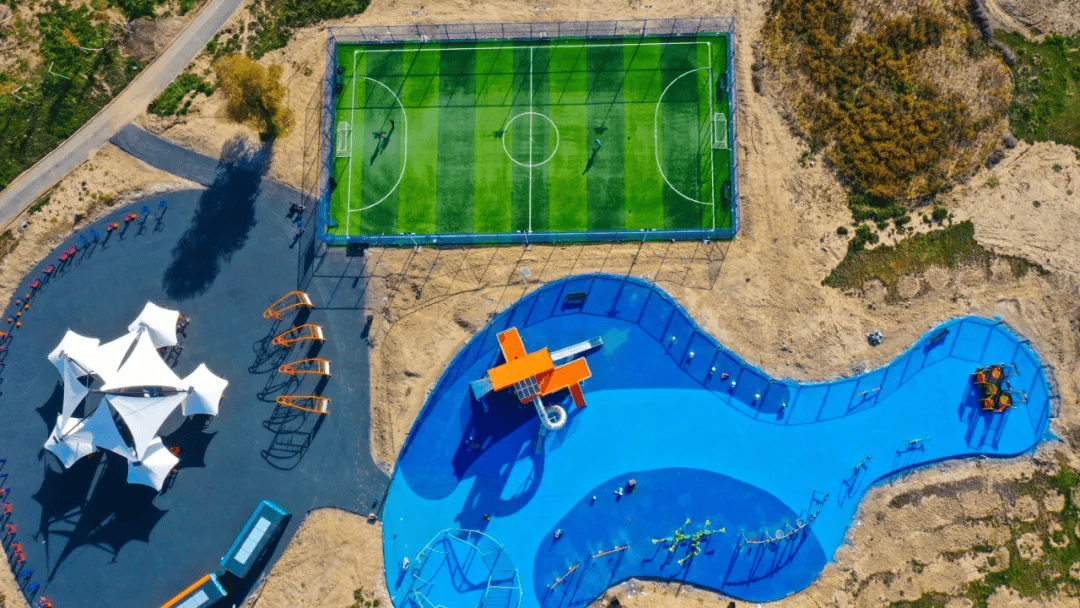 - 健身器械区、儿童乐园(蹦床、集装箱滑梯、攀爬网等)、滑板公园。