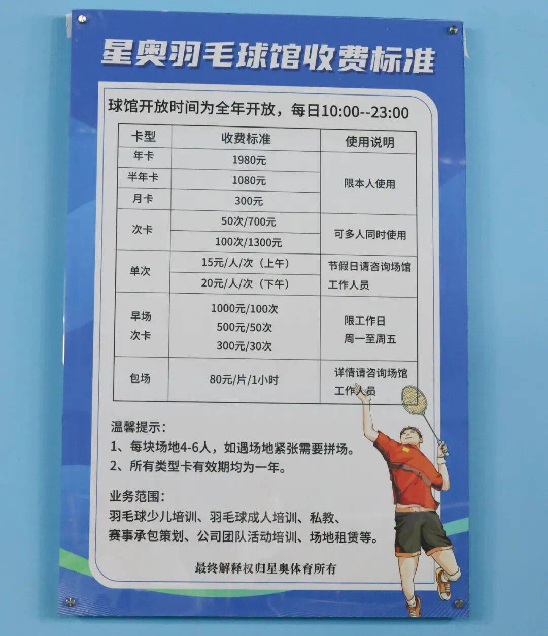 - 羽毛球馆:开放时间10:00-23:00,单次上午15元、下午20元。抖音“星奥羽毛球馆”月卡300元30次,并提供小班教学。