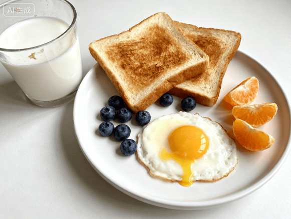 早餐组合示例:鸡蛋1个 + 牛奶1杯 + 烤全麦面包1片 + 一小把坚果豆浆1碗 + 鸡胸肉片几片 + 水果半个 + 豆腐或凉拌菜一份