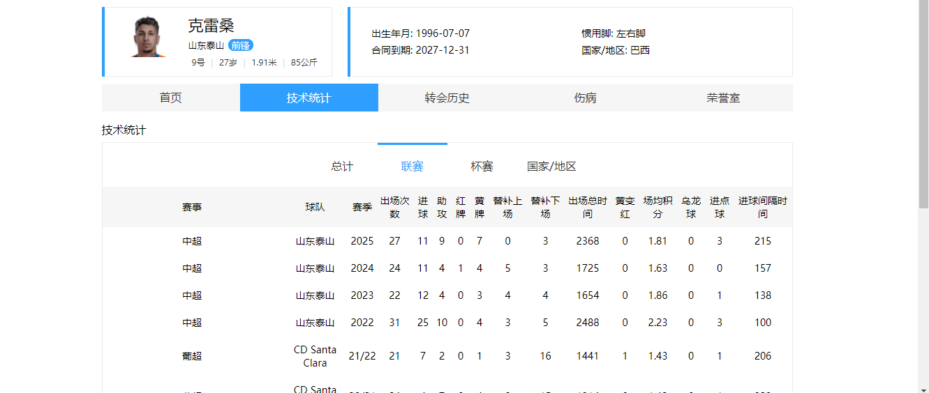 克雷桑是山东泰山队外援,1996年出生,现今29岁,身高1米91,体重85公斤,在场司职前锋。