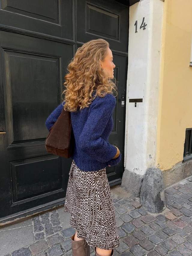 她绝不为美挨冻,用灰色毛衣搭配羽毛长裙,自然,舒服。
