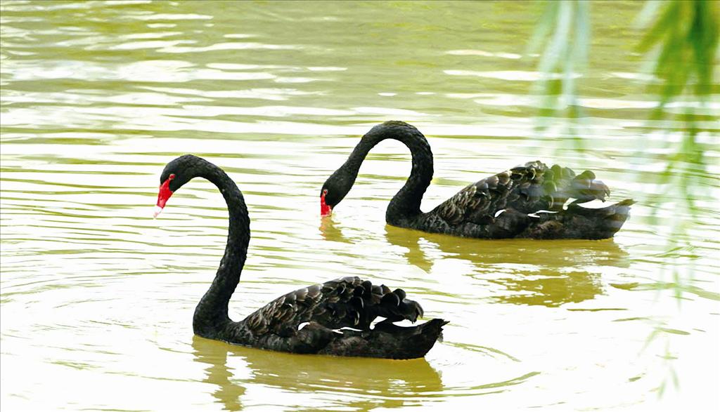 黑天鹅夫妇:形影不离,羽毛乌黑发亮,橘红色嘴鲜艳夺目,时而“耳鬓厮磨”,时而引吭高歌,毫无怯意地与宾客互动;