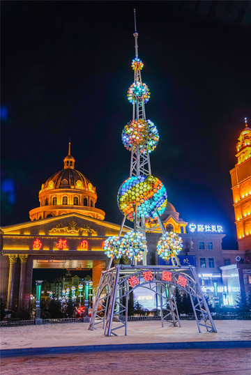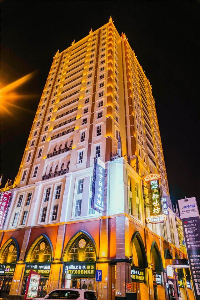 套娃酒店伫立在套娃广场中央,周围建筑色彩斑斓,仿佛打翻的调色盘。