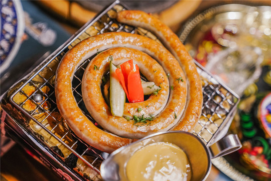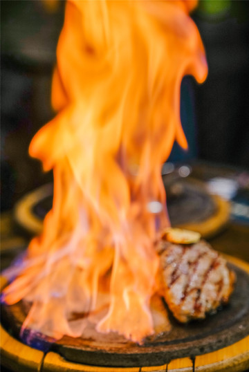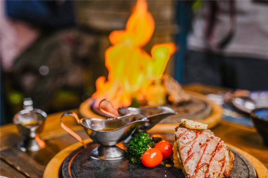 火焰牛排:白兰地点燃的仪式感,七分熟肉质鲜嫩。
