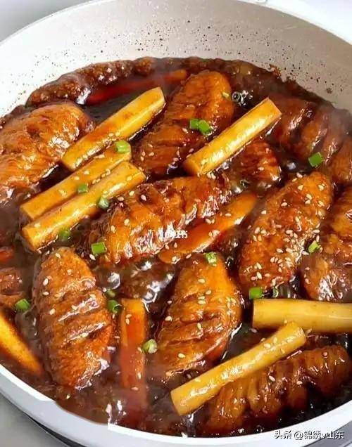 8. 开大火收汁,不停翻炒,直到汤汁浓稠、亮晶晶地裹在鸡翅和年糕上,关火装盘,撒上白芝麻。