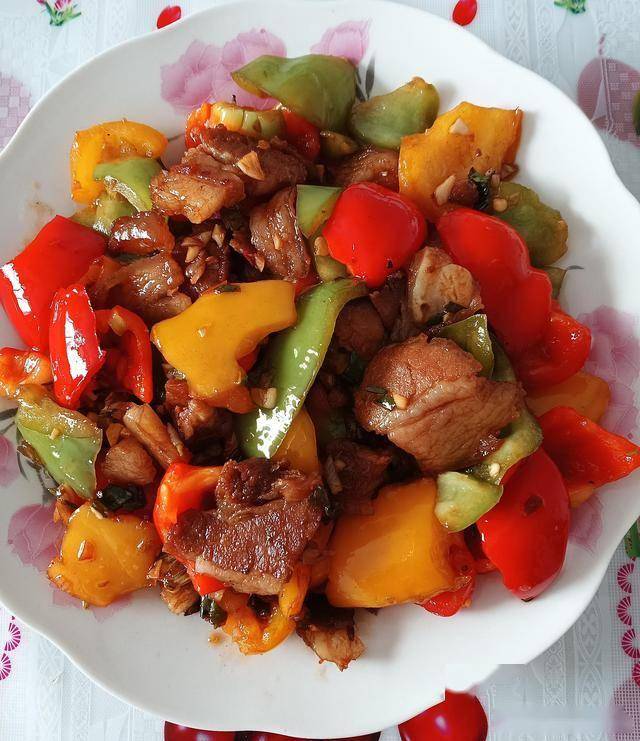 五花肉200克,红、黄、绿彩椒各半个。配料:大蒜、豆豉(可选,风味更足)。调料:生抽、老抽、糖、盐。
